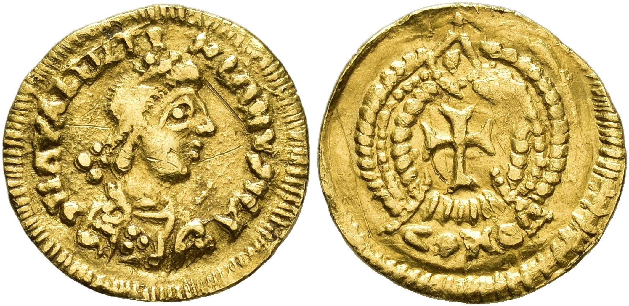 REINO SUEVO. Tremissis. A nombre de Valentiniano. AU 1,09 g. 14,4 mm. C&M-lám. 6.5, mismo ejemplar; Orol-SU.2, mismo ejemplar. Raya en anv. MBC. Rara.