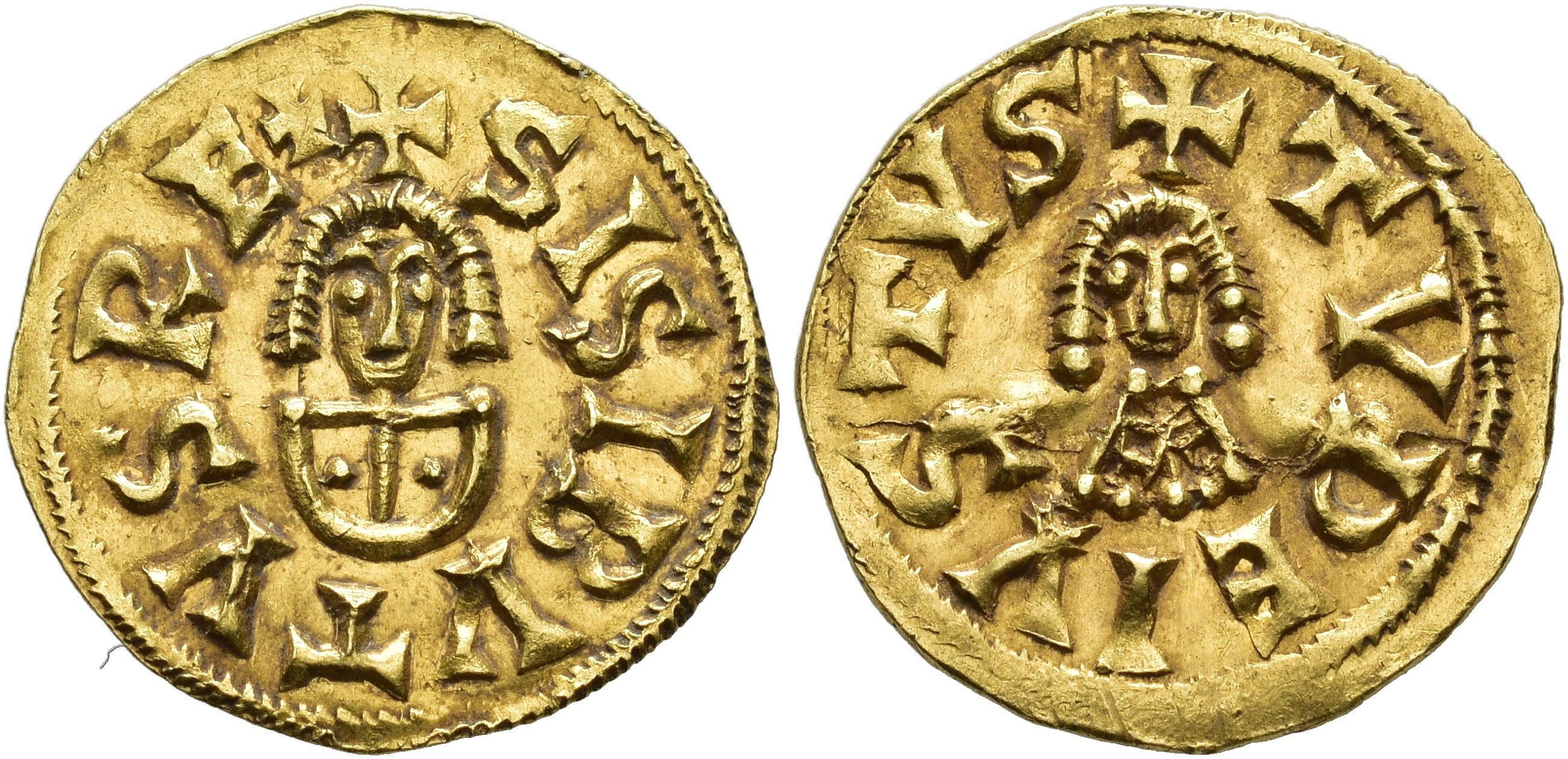 REYES VISIGODOS. SISEBUTO. Tremissis. Tude. AU 1,6 g. 17,7 mm. CNV-251.1, mismo ejemplar citado; Orol-VI.10, mismo ejemplar. MBC+. Muy rara.