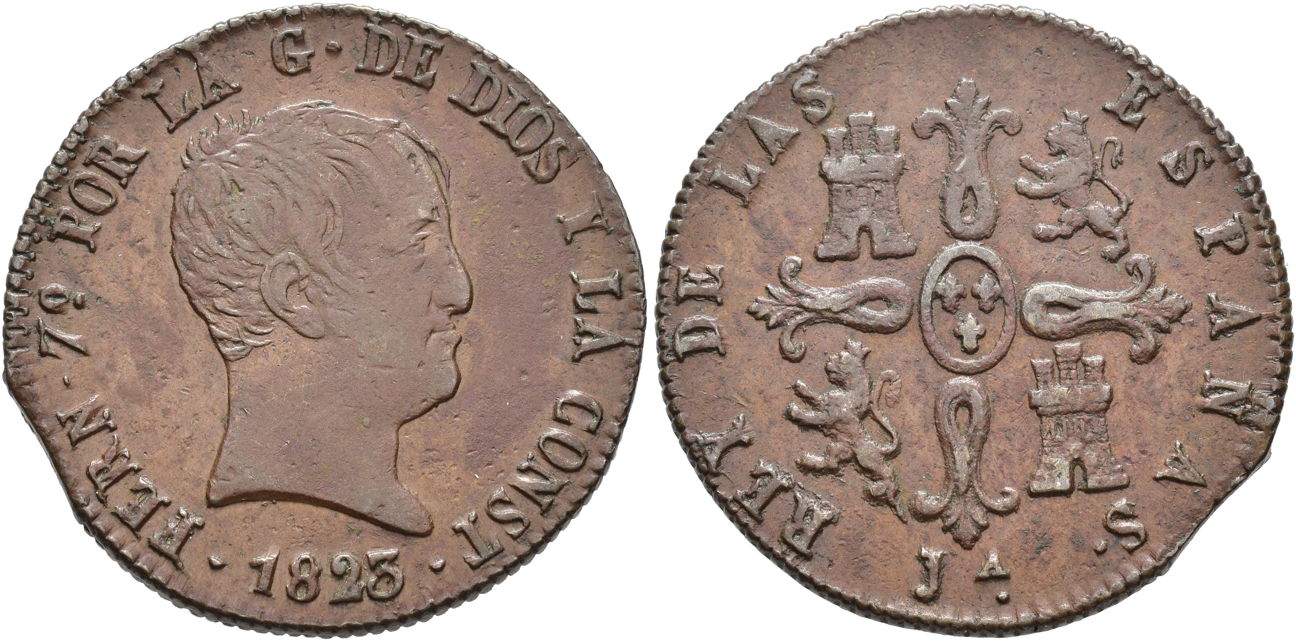 FERNANDO VII. 8 maravedís. Jubia. 1823. Sin valor. CU 10,82 g. 29,3 mm. VI-213; AC-205; Orol-JU.16A, mismo ejemplar. Ligero final de plancha. MBC. Rara.