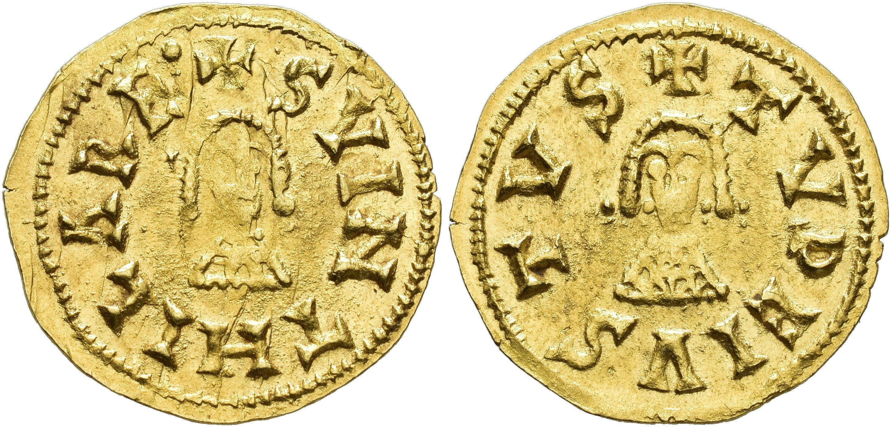 REYES VISIGODOS. SUINTHILA. Tremissis. Tude. AU 1,53 g. 19,8 mm. CNV-321.4, mismo ejemplar ilustrado; Orol-VI.14, mismo ejemplar. Acuñación floja en los bustos. MBC. Muy rara.
