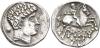 HISPANIA ANTIGUA. AREKORATAS. Denario. A/ Cabeza con collar a der., detrás glóbulo. R/ Jinete lancero a der., un pie visible, debajo AREKoR/ATaS. AR 3,8 g. 19,2 mm. I-109; ACIP-1750. Leves erosiones. MBC+. Rara.
