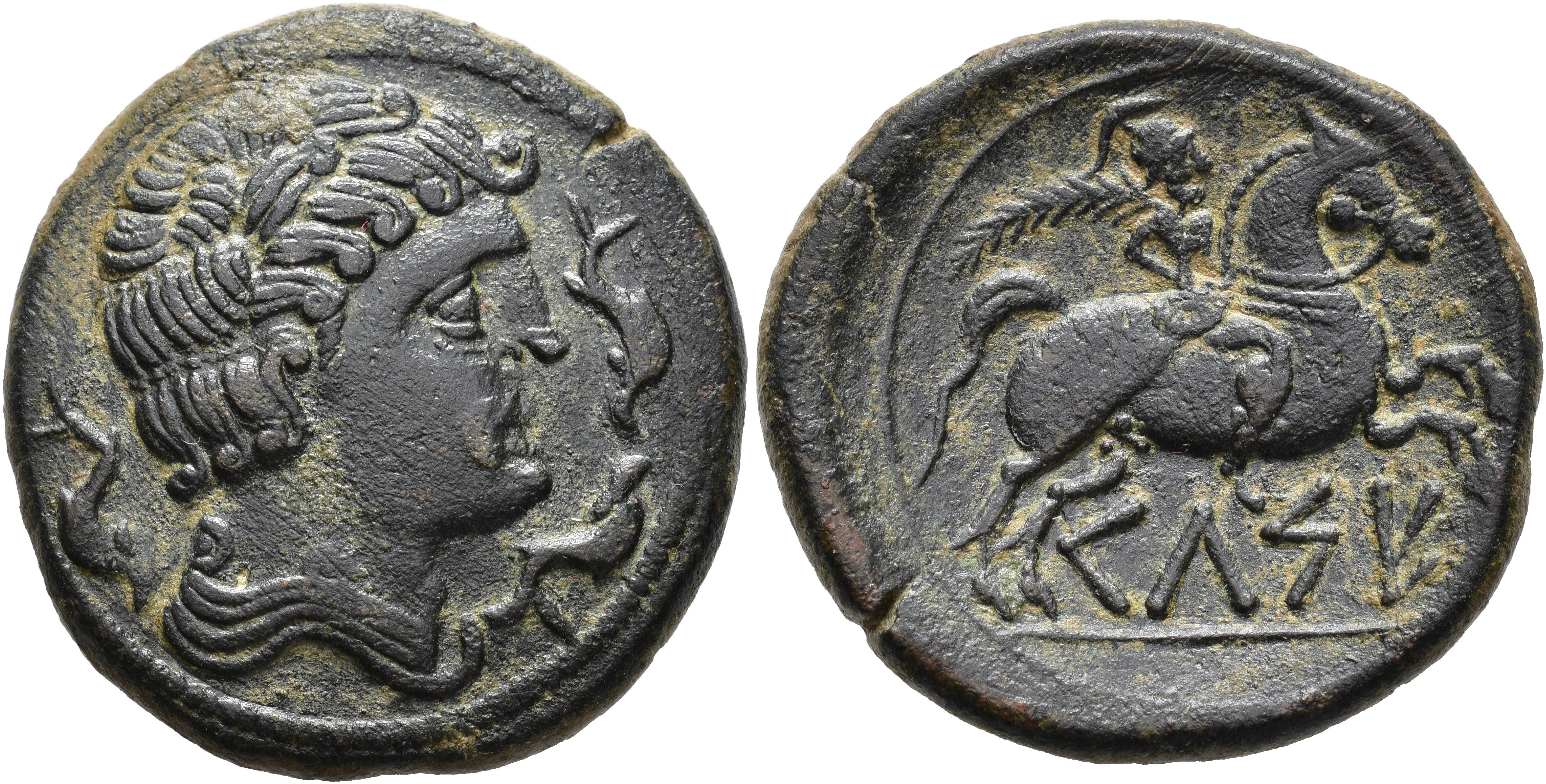 HISPANIA ANTIGUA. KELSE. Unidad. A/ Cabeza drapeada a der., alrededor tres delfines. R/ Jinete con palma a der., debajo sobre línea KeLSE. AE 16,5 g. 30,3 mm. I-771; ACIP-1483. Pátina verde oscuro. EBC.