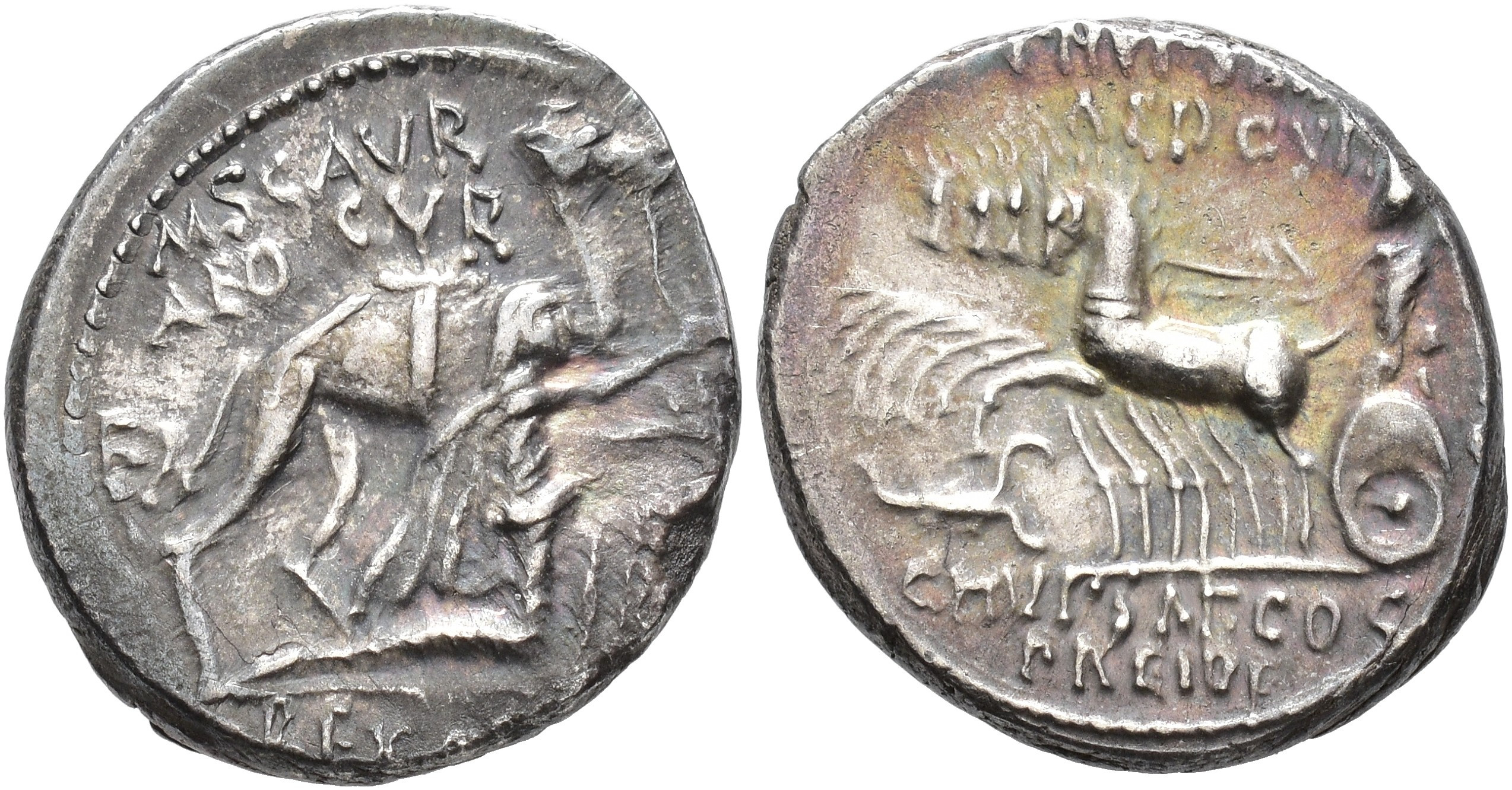 REPÚBLICA ROMANA. AEMILIA. M. Aemilius Scaurus y Pub. Plautius Hypsaeus. Denario. Roma (58 a.C.). A/ Aretas de rodillas a der. con rama de olivo, delante de su camello; M SCAVR /AED CVR, en exergo REX (ARETAS), en campo EX-(SC). R/ Júpiter en cuadriga a izq., escorpión bajo los caballos; C HVPSAEVS/AED CVR/C HVPSAE COS/PREIVE, detrás (CAPTV). AR 3,86 g. 17,7 mm. CRAW-422.1b; FFC-120. EBC-.