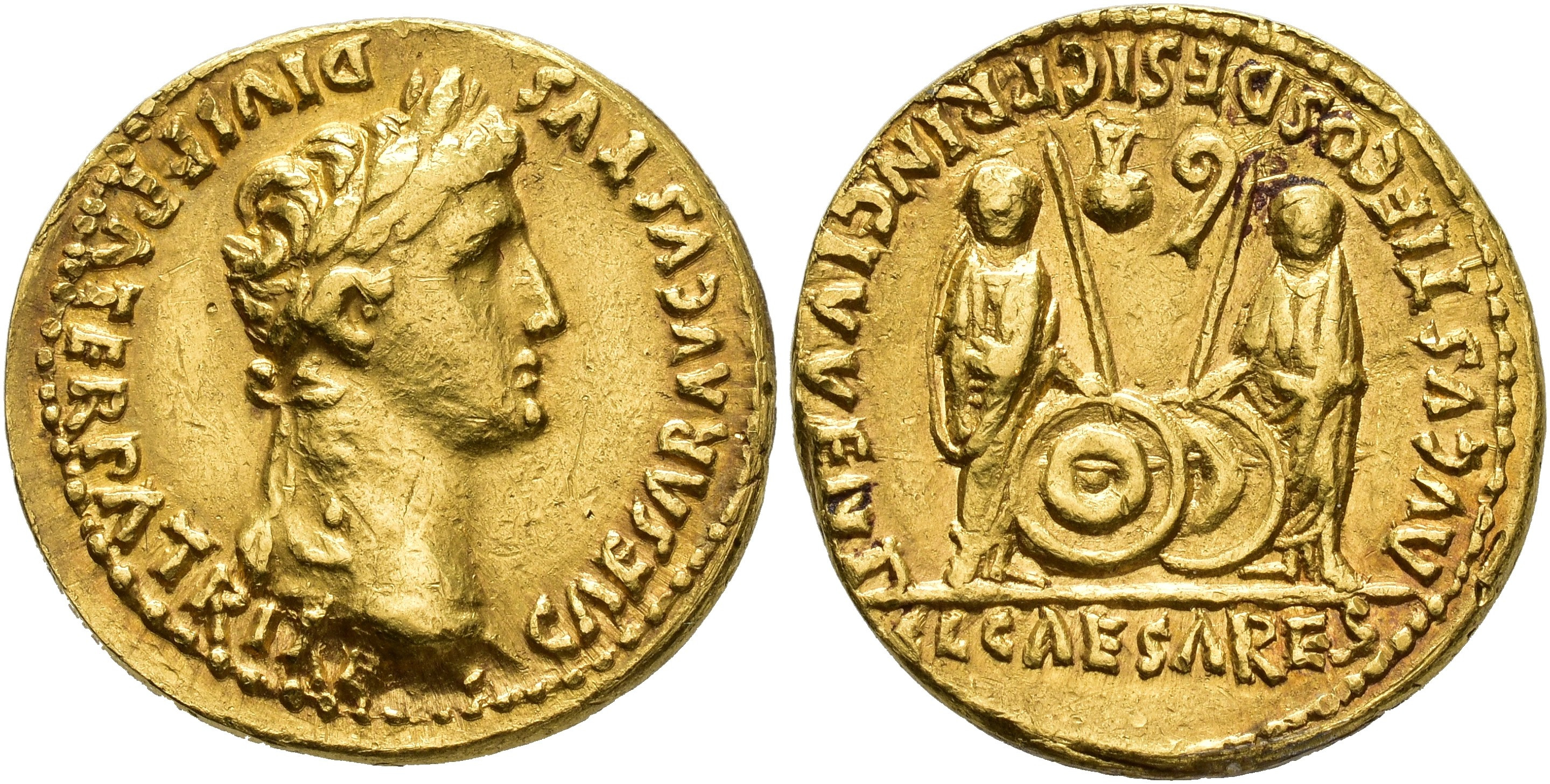 PERIODO DE JULIO CÉSAR A AUGUSTO. AUGUSTO. Áureo. Lugdunum (2 a.C.-4 d.C.). A/ Cabeza laureada a der.; CAESAR AVGVSVTVS DIVI F PATER PATRIAE. R/ Cayo y Lucio togados con lanza y escudo; en medio símpulo a izq. y lítuo a der.; C L.CAESARES AVGVSTI F. COS. DESIG. PRINC. IVVENT. AU 7,43 g. 19,1 mm. RIC-206; CAL-176. Canto limado. Estuvo engarzada. MBC+.