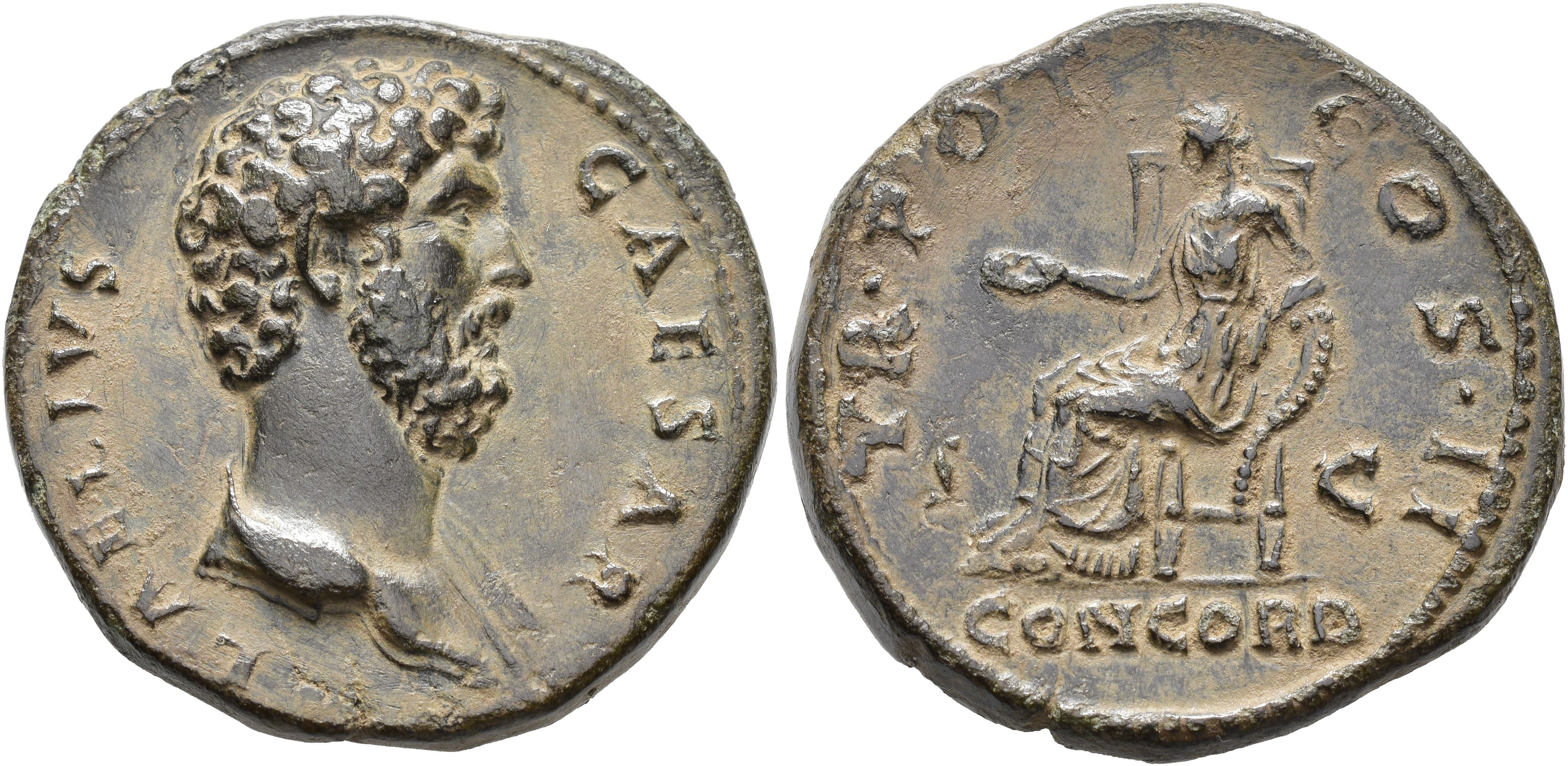 IMPERIO ROMANO. L. ELIO VERO (bajo Adriano). Sestercio. Roma (137). A/ Busto drapeado al hombro a der.; L AELIVS CAESAR. R/ Concordia sentada a izq. con pátera y apoyada en cornucopia; TR POT COS II S-C, exergo CONCORD. AE 25 g. 30,5 mm. RIC-2651. Pátina verde oscuro. Bonito retrato. EBC-/MBC+. Muy escasa.