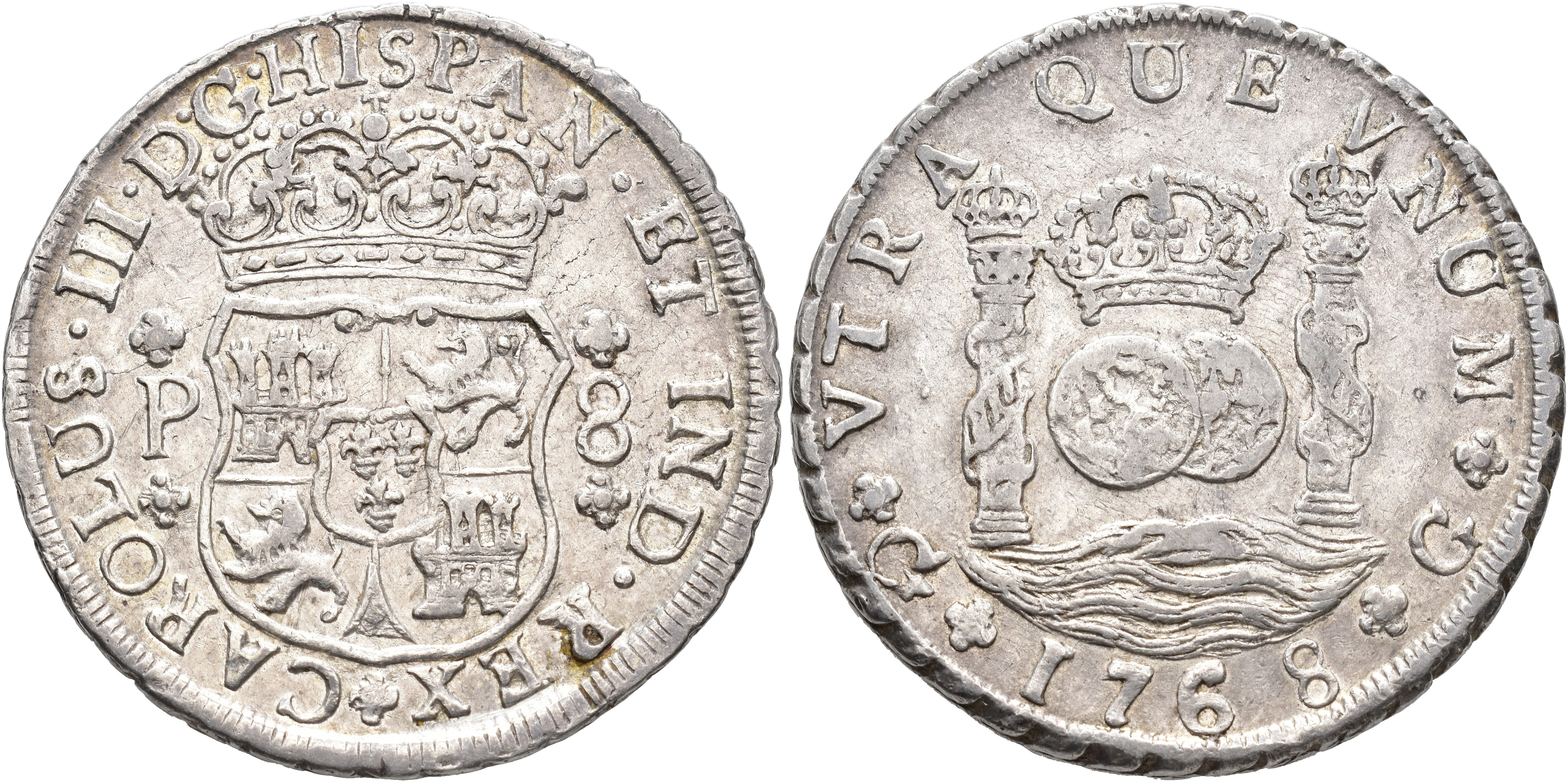 CARLOS III (1759-1788). 8 reales. Guatemala. 1768. P. AR 26,88 g. 40,1 mm. VI-853; AC-1000. R.B.O. MBC+. Escasa.