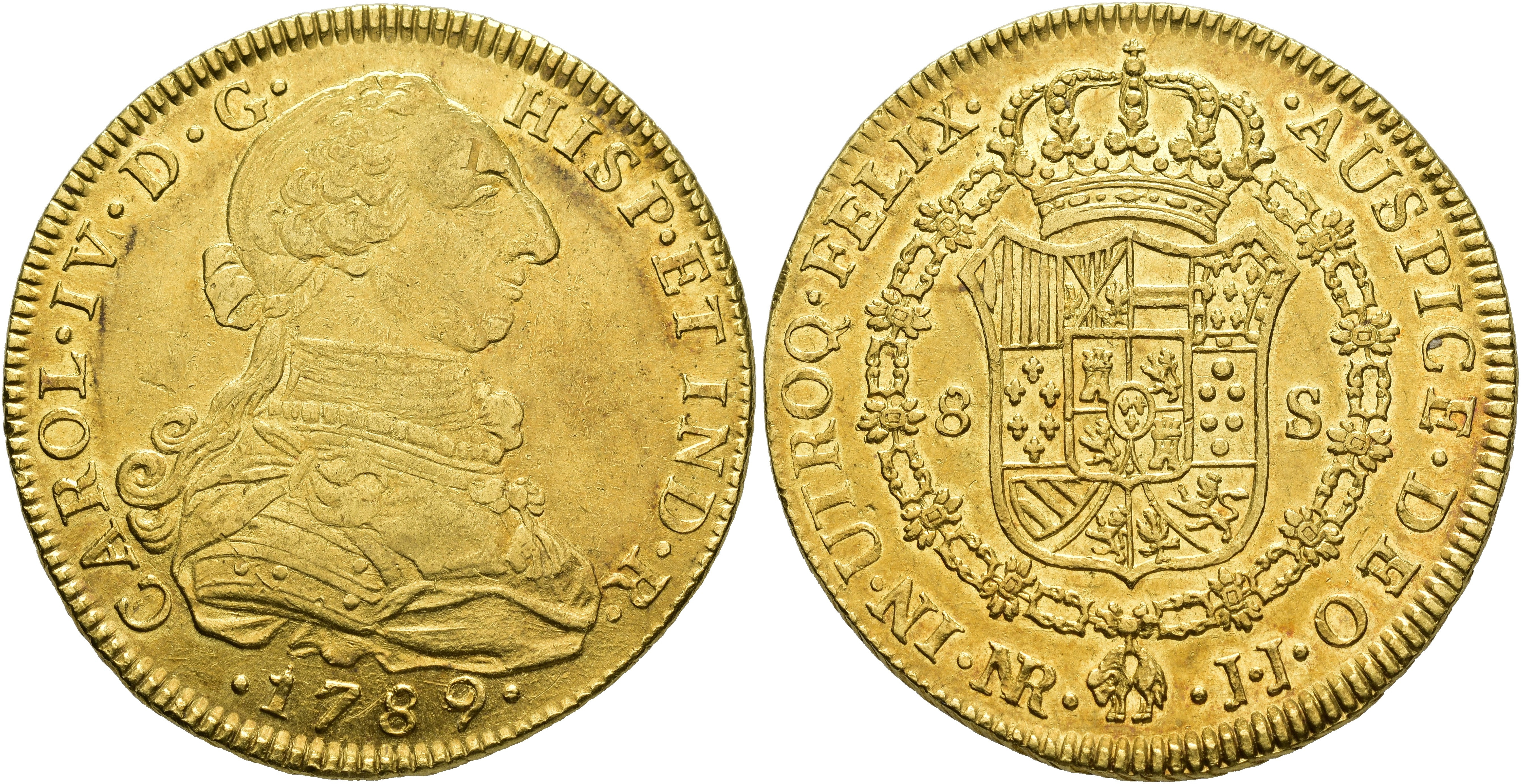 CARLOS IV (1788-1808). 8 escudos. Nuevo Reino. 1789. JJ. AU 27,05 g. 38 mm. VI-1346; AC-1715. Rayita e I incusa en anv. B.O. EBC.