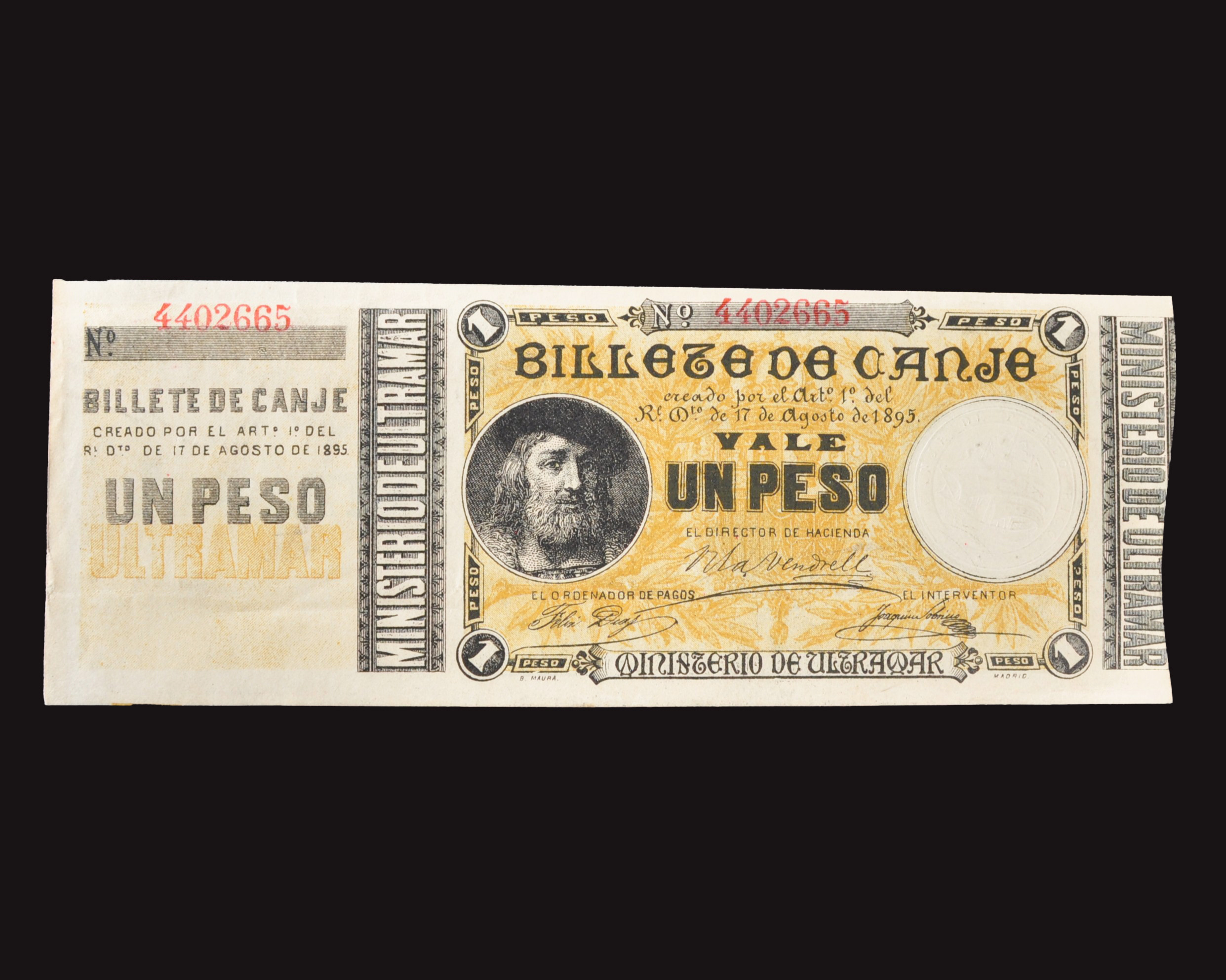 BILLETES Y ACCIONES DE CUBA Y PUERTO RICO. Ministerio de Ultramar. Puerto Rico. Billete de canje. 1 peso. 17 de agosto de 1895. Conserva matriz izq. Pick.-7a; ED-11. EBC.