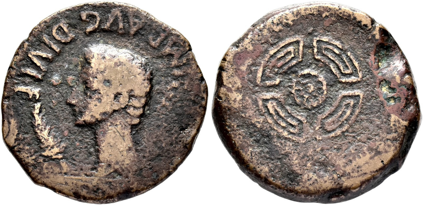HISPANIA ANTIGUA. EMISIONES DEL NOROESTE. AUGUSTO. As. A/ Cabeza a izq., delante palma, detrás caduceo; IMP AVG DIVI F. R/ Rodela. AE 10,21 g. 24,6 mm. I-1706; APRH-3; ACIP-3301; Orol-AN.8, mismo ejemplar. Vano. BC+/MBC.