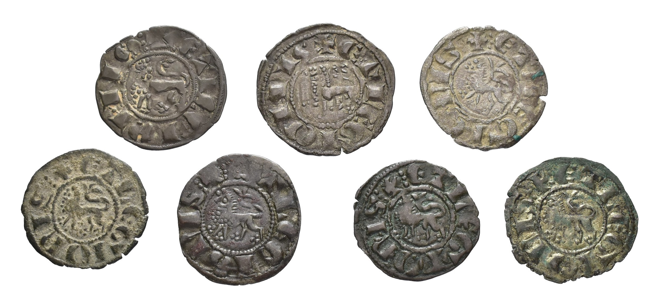 REINOS DE CASTILLA Y LEÓN. FERNANDO IV. Lote de 7 dineros, Coruña. Orol-ME.284, 285, 298, 299, 301, 303 y 306. MBC/MBC+.