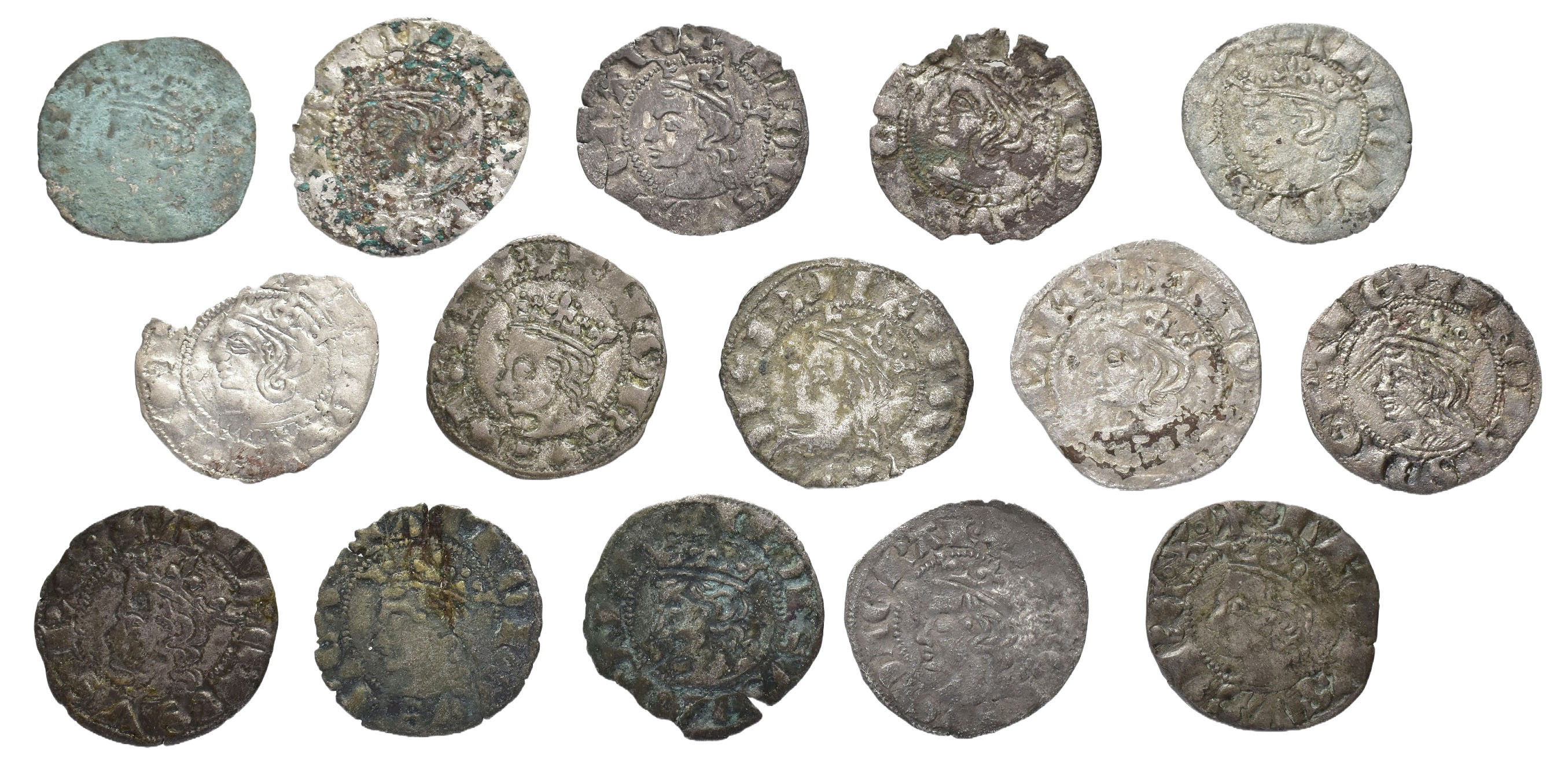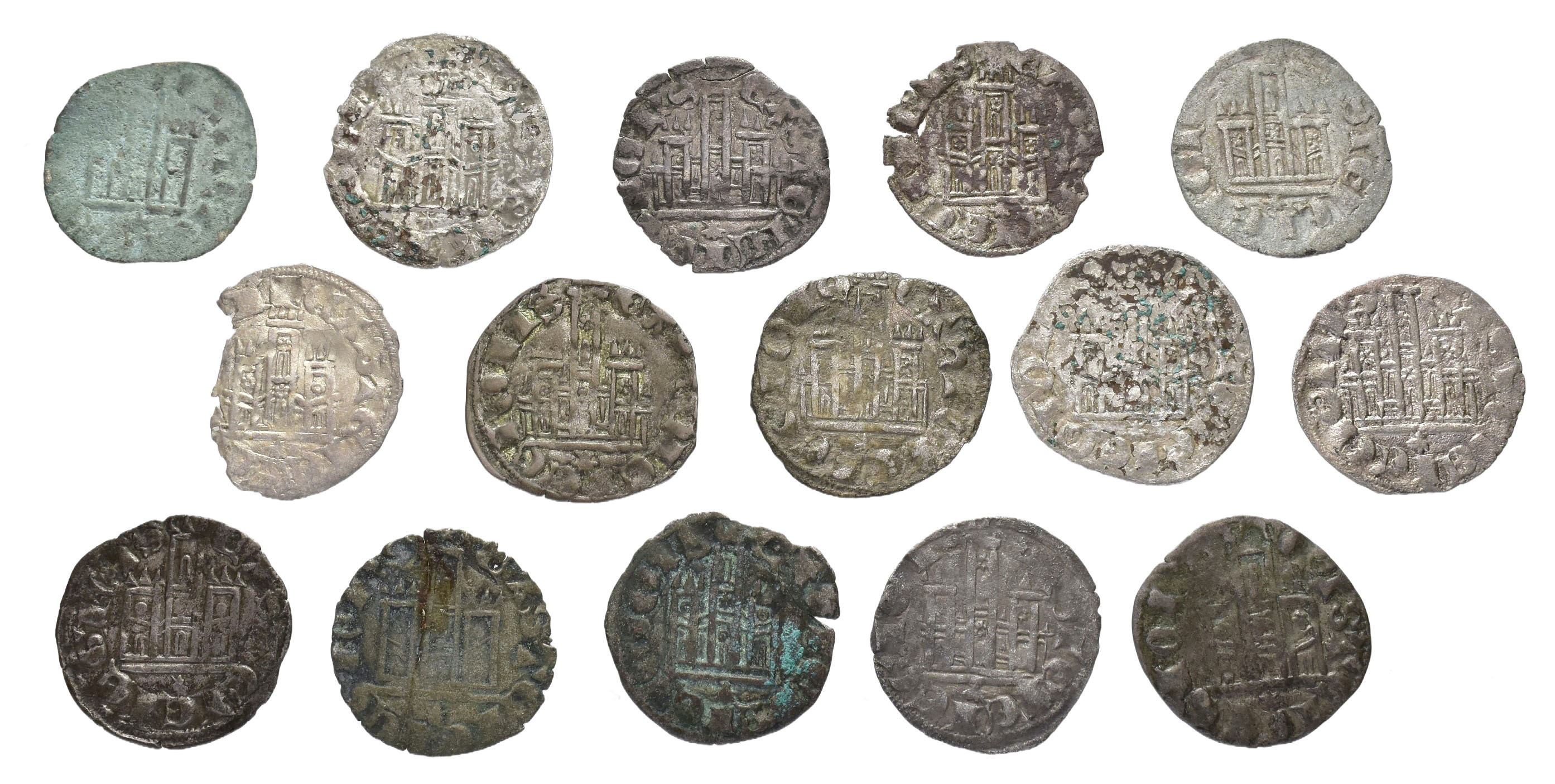 REINOS DE CASTILLA Y LEÓN. ALFONSO XI. Lote de 15 cornados, Coruña, variantes de venera. Orol-ME.376, 377, 379, 381, 382, 384, 389, 392, 395, 397, 402, 405, 407, 409 y 410. Dos con roturas y uno oxidado. BC/MBC.