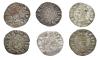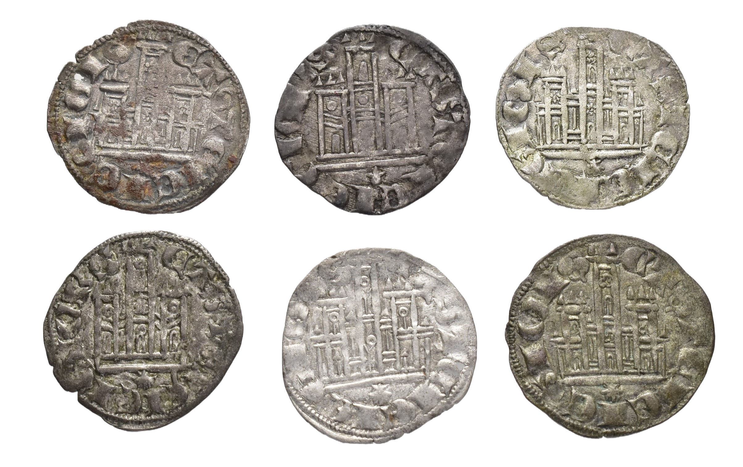 REINOS DE CASTILLA Y LEÓN. ALFONSO XI. Lote de 6 cornados, Coruña, variantes de tipo de venera. Orol-ME.380, 383, 388, 398, 403 y 404. MBC/EBC-.
