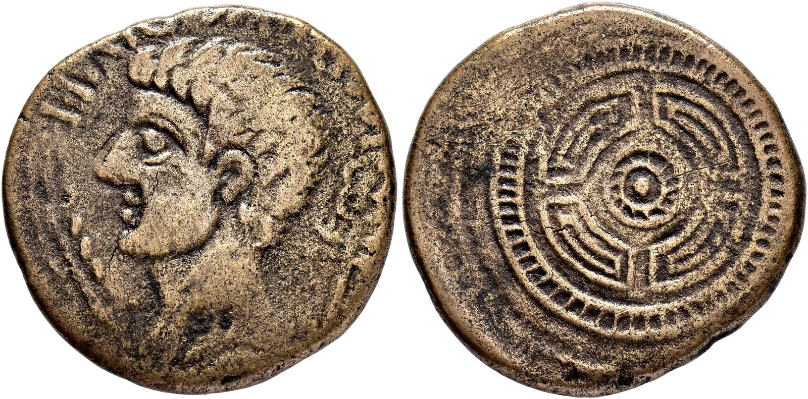HISPANIA ANTIGUA. EMISIONES DEL NOROESTE. AUGUSTO. As. A/ Cabeza a izq., delante palma, detrás caduceo; IMP AVG DIVI F, poco visible. R/ Rodela, alrededor dos círculos concéntricos unidos por líneas. AE 12,33 g. 27,9 mm. I-1703; APRH-4; ACIP-3302; Orol-AN.40, mismo ejemplar. MBC-.
