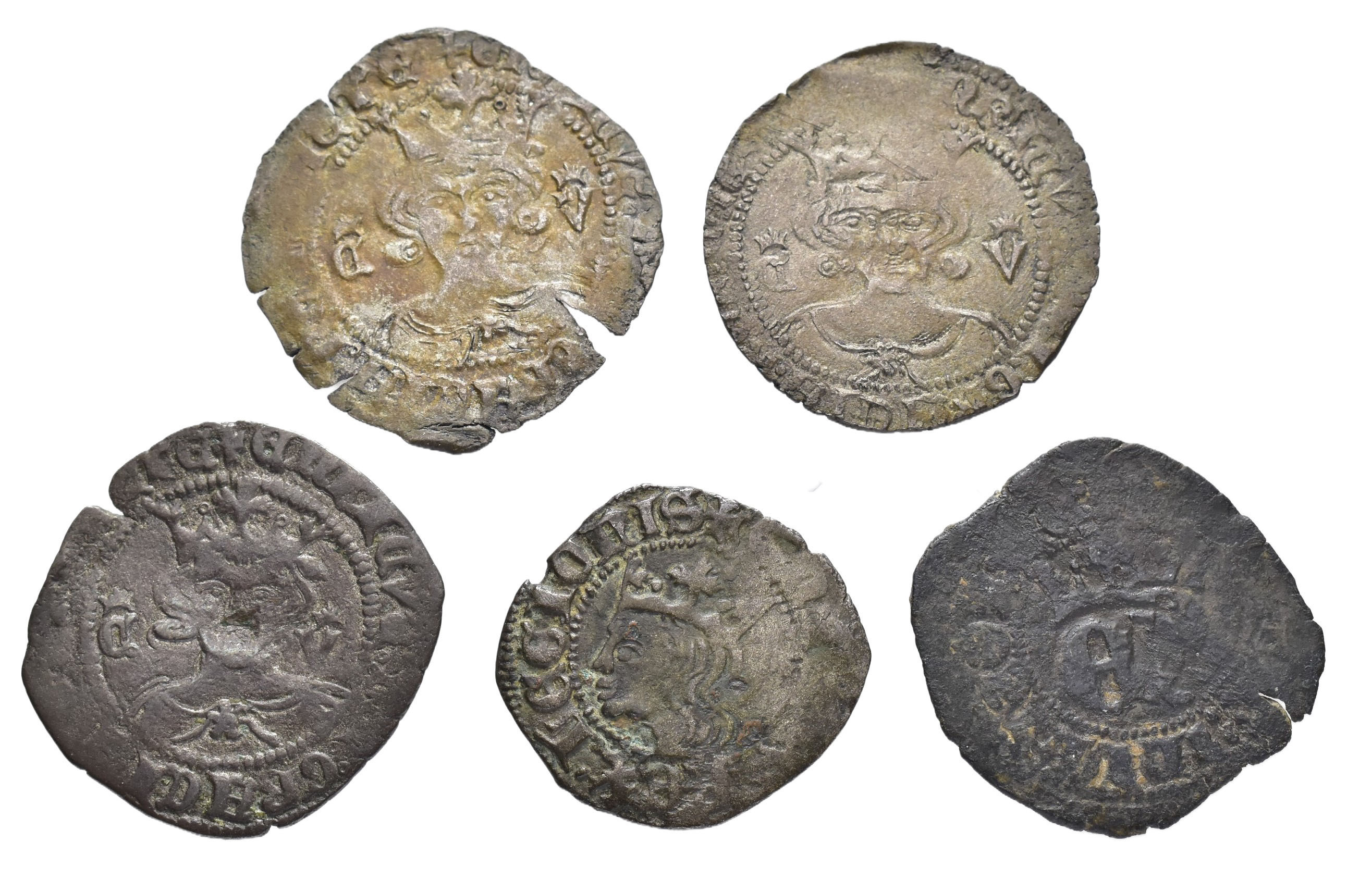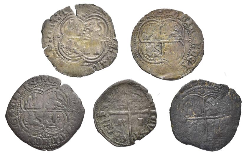 REINOS DE CASTILLA Y LEÓN. ENRIQUE II. Lote de 5 piezas: 4 reales de vellón, Coruña, y un cruzado, posiblemente Coruña. Orol-ME.428, 431, 432, 435 y 439. BC/MBC-.