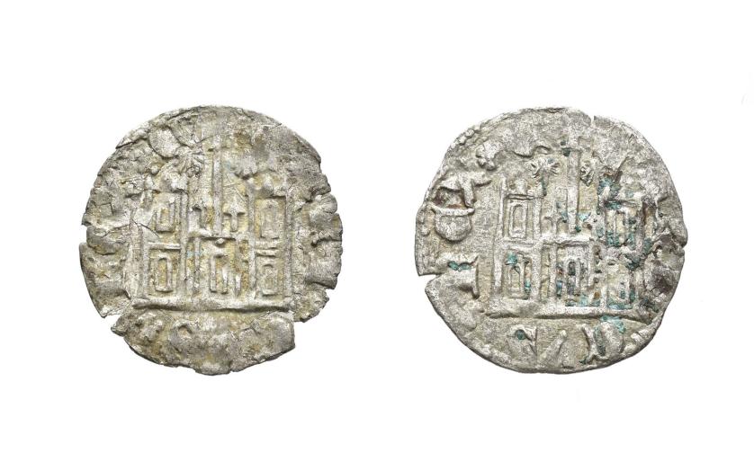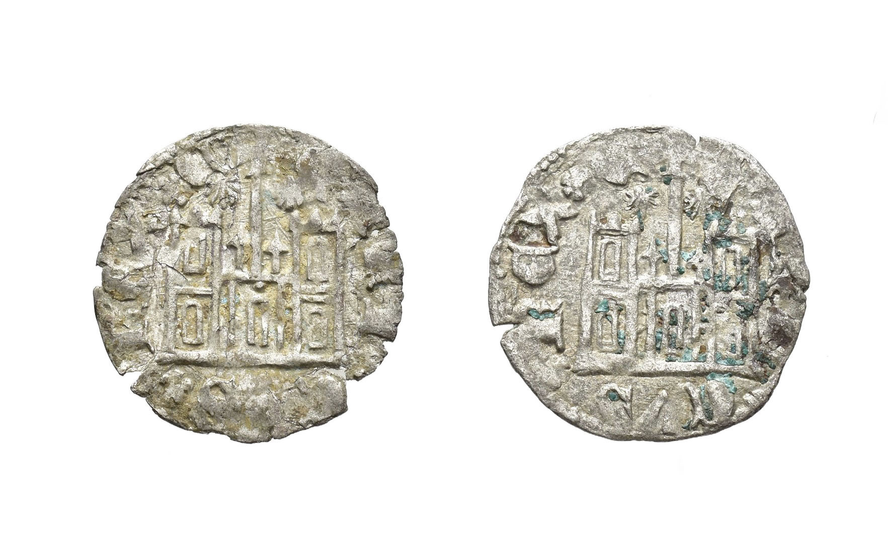 REINOS DE CASTILLA Y LEÓN. ENRIQUE II. Lote de 2 cornados, Santiago, venera sobre las torres muy claras. Orol-ME.463 y 467. BC/MBC.