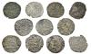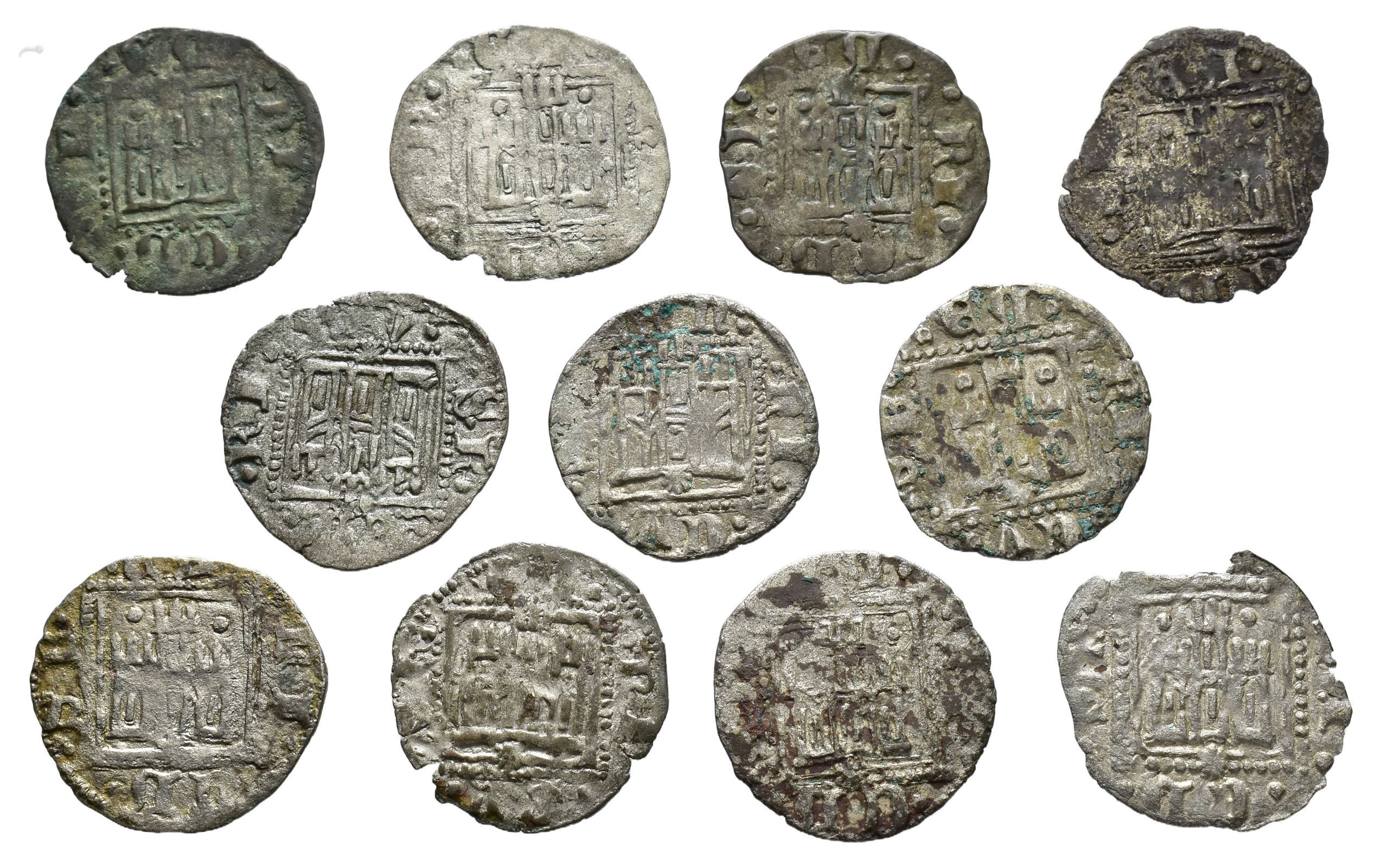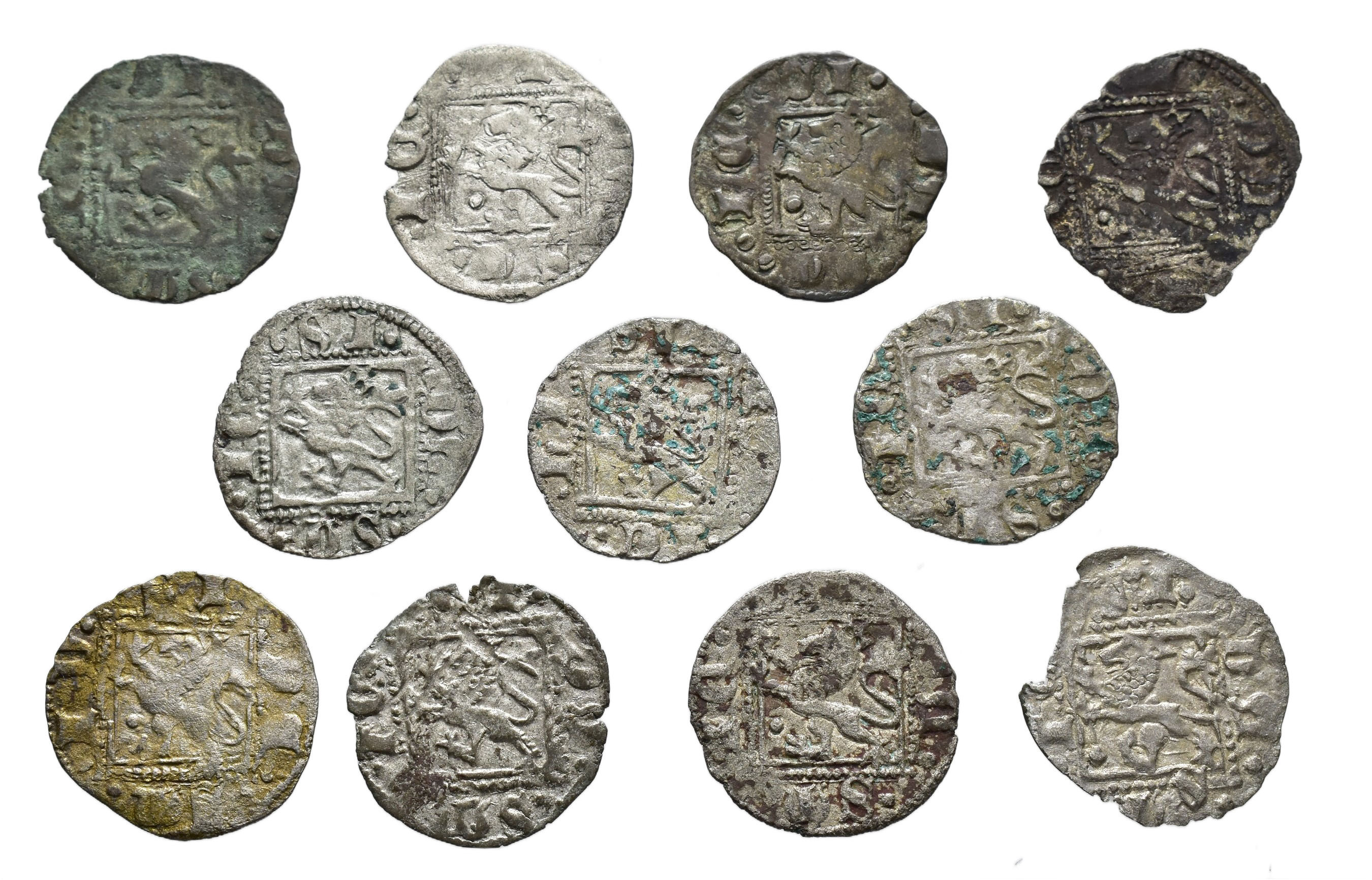 REINOS DE CASTILLA Y LEÓN. ENRIQUE II. Lote de 11 dineros, Santiago, con venera y leyenda religiosa. Orol-ME.481, 483, 485, 487, 490, 493, 497, 499, 505, 507 y 510. Calidad media BC+.