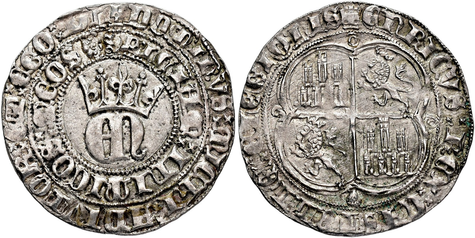 REINOS DE CASTILLA Y LEÓN. ENRIQUE II. Real. Coruña. Aspas separando las leyendas. R/ +ENRICVS REX CASTELLE ELEGIONIS. AR 3,53 g. 25,3 mm. III-404; BMM-556; Orol-ME.441. MBC+.