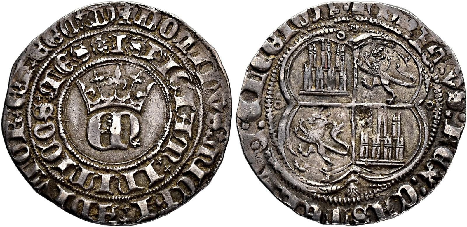 REINOS DE CASTILLA Y LEÓN. ENRIQUE II. Real. Coruña. Aspas separando las leyendas. R/ +ENRICVS: REX: CASTELLE: ELEGION. AR 3,47 g. 24,8 mm. III-404; BMM-556; Orol-ME.445. MBC+.