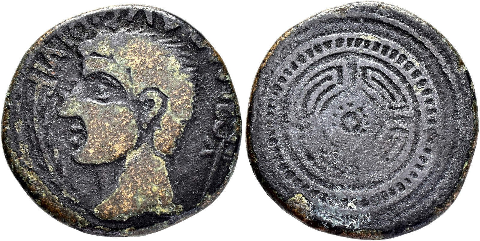HISPANIA ANTIGUA. EMISIONES DEL NOROESTE. AUGUSTO. As. A/ Cabeza a izq., delante palma, detrás caduceo; (IMP) AVG DIVI F, poco visible. R/ Rodela, alrededor dos círculos concéntricos unidos por líneas. AE 12,22 g. 27,6 mm. I-1703; APRH-4; ACIP-3302; Orol-AN.29, mismo ejemplar. Pátina oscura. MBC-/BC+.