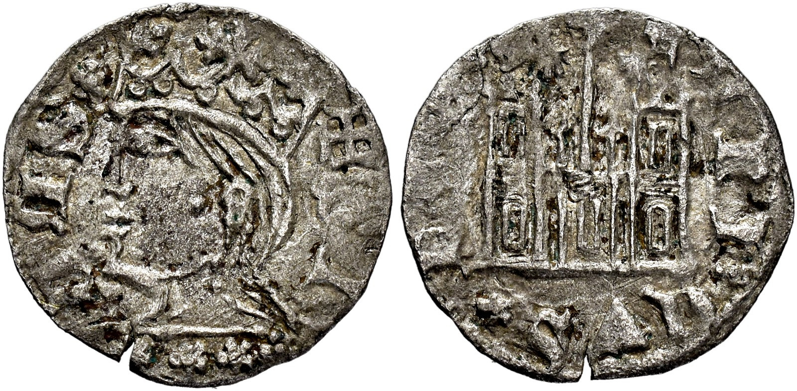 REINOS DE CASTILLA Y LEÓN. ENRIQUE II. Cornado. Santiago. Veneras sobre torres. A/ +SI-DNS. R/ ENRICVS R--. VE 0,66 g. 17,9 mm. III-482; BMM-664,1; Orol-ME.462. Erosiones. MBC+. Muy escasa.