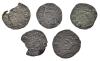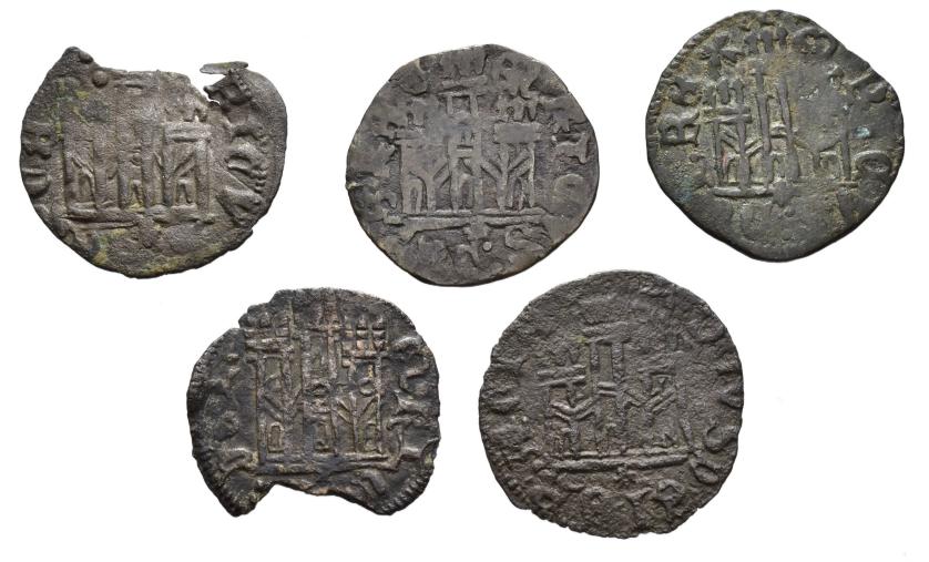REINOS DE CASTILLA Y LEÓN. ENRIQUE III. Lote de 5 cornados, Coruña. Orol-ME.594, 595, 598, 599 y 600. Dos con roturas. BC-/MBC-.