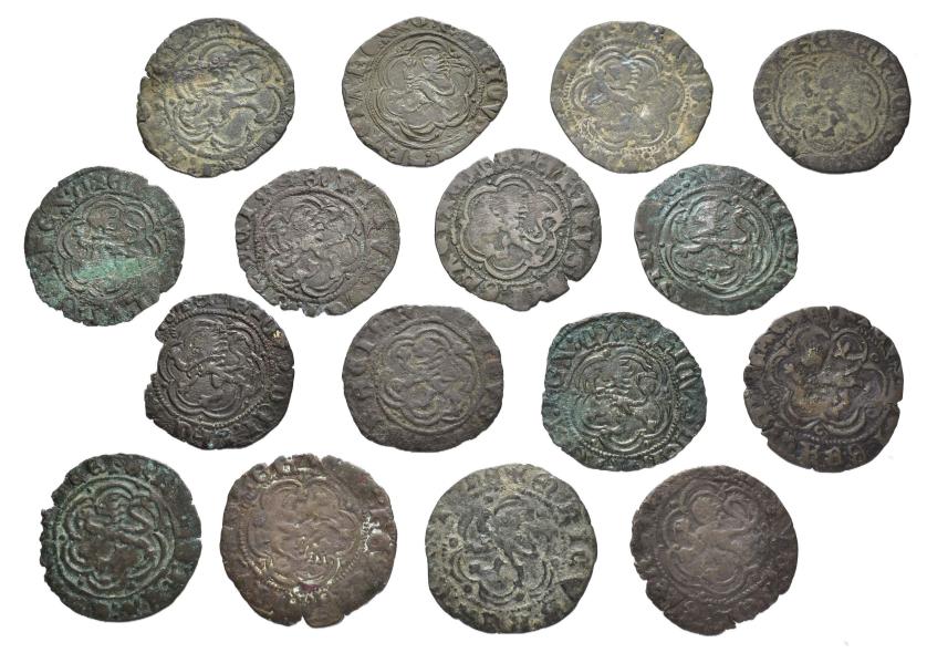 REINOS DE CASTILLA Y LEÓN. ENRIQUE III. Lote de 16 blancas, Coruña. Orol-ME.533, 536, 538, 540, 544, 546, 548, 554, 556, 559, 561, 565, 569, 572, 575 y 577. RC/MBC-.