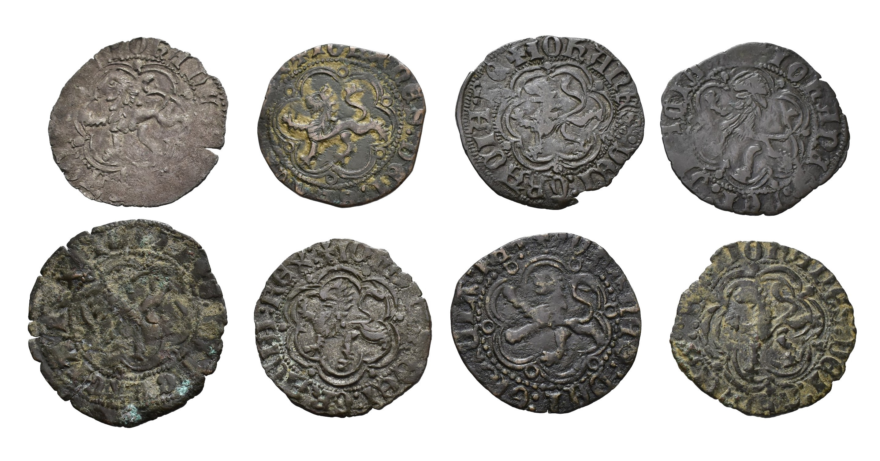 REINOS DE CASTILLA Y LEÓN. JUAN II. Lote de 8 blancas, Coruña. Orol-ME.604, 611, 625, 629, 631, 635, 644 y 652. MBC-/MBC+.