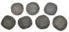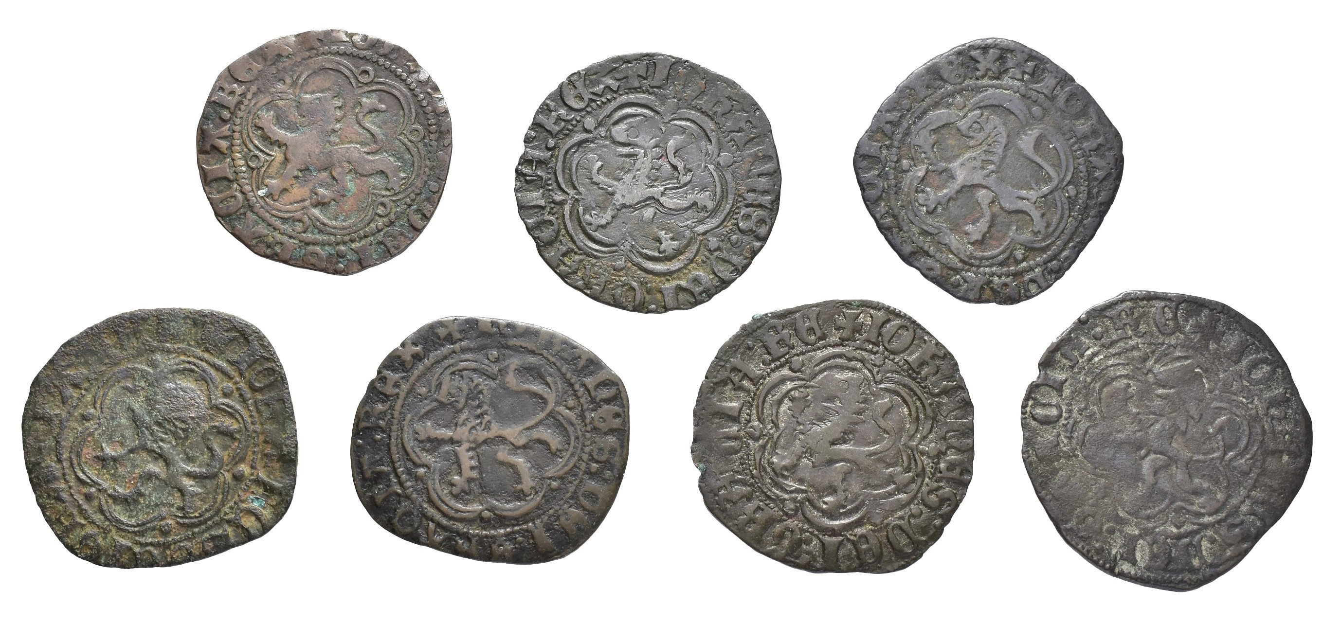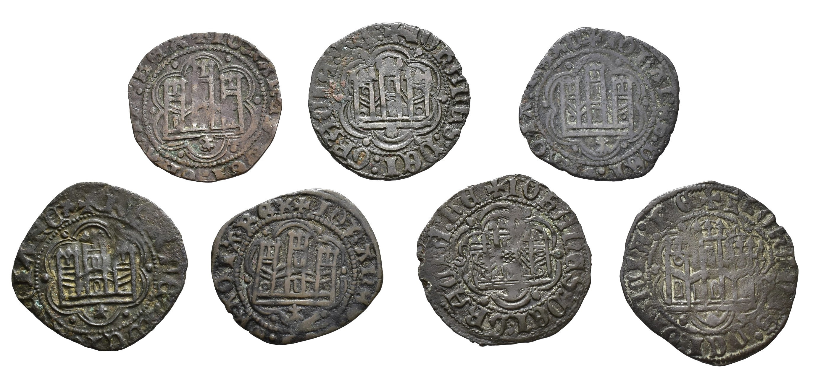 REINOS DE CASTILLA Y LEÓN. JUAN II. Lote de 7 blancas, Coruña. Orol-ME.609, 620, 627, 634, 640, 643 y 651. MBC-/MBC.