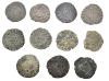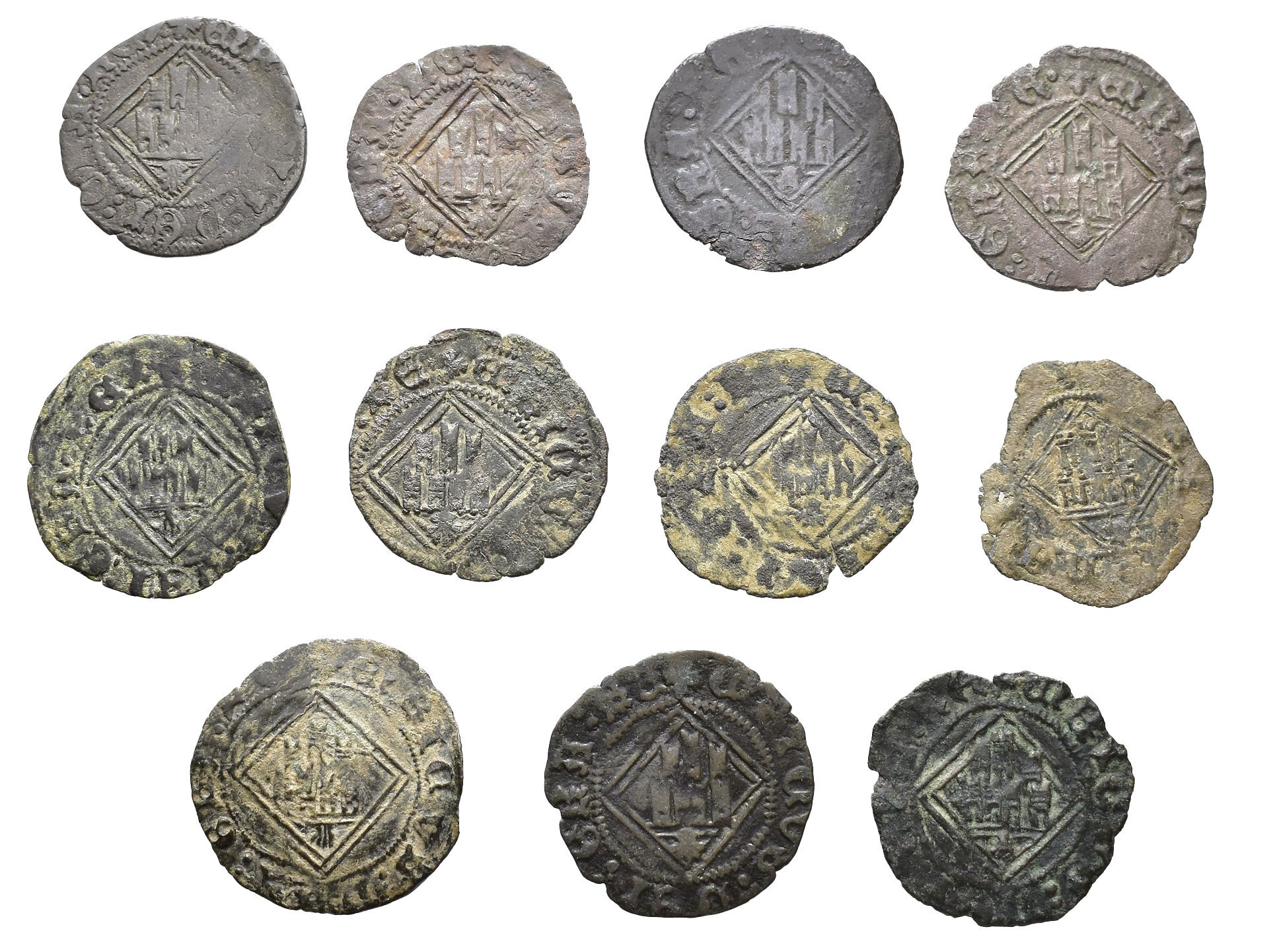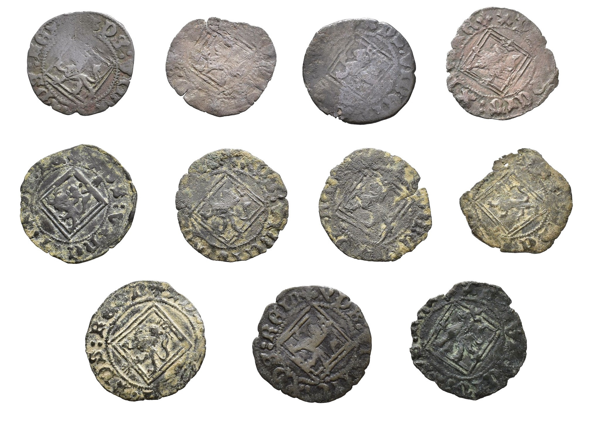 REINOS DE CASTILLA Y LEÓN. ENRIQUE IV. Lote de 11 blancas de rombo, Coruña. Orol-ME. 697, 699, 702, 704, 709 (con venera en anv. y rev.), 712, 714, 716, 718, 720 y 722. RC/MBC-.
