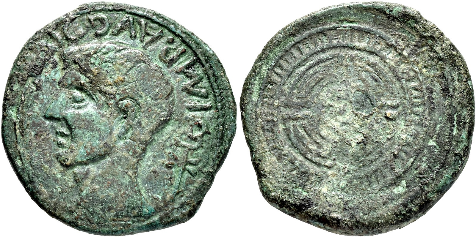 HISPANIA ANTIGUA. EMISIONES DEL NOROESTE. AUGUSTO. As. A/ Cabeza a izq., delante palma, detrás caduceo; IMP AVG DIV(I F). R/ Rodela, alrededor dos círculos concéntricos unidos por líneas. AE 11,9 g. 29,6 mm. I-1703; APRH-4; ACIP-3302; Orol-AN.48. Pátina verde. MBC-/BC.