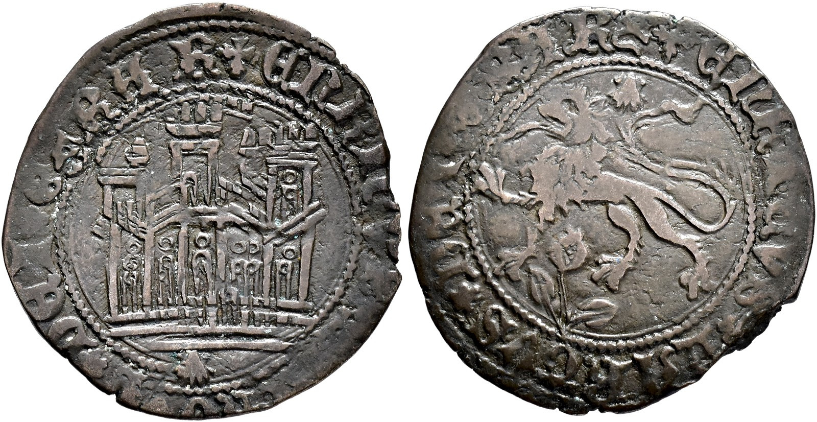 REINOS DE CASTILLA Y LEÓN. ENRIQUE IV. Maravedí. Coruña. Venera en anv. y rev. A/ + ENRICVS---RTVS DEI GRA R. R/ + ENRICVS QARTVS DEI GRA RX. VE 2,1 g. 25,2 mm. III-793.2 var.; BMM-961.2; Orol-ME.679 MBC. Muy escasa.