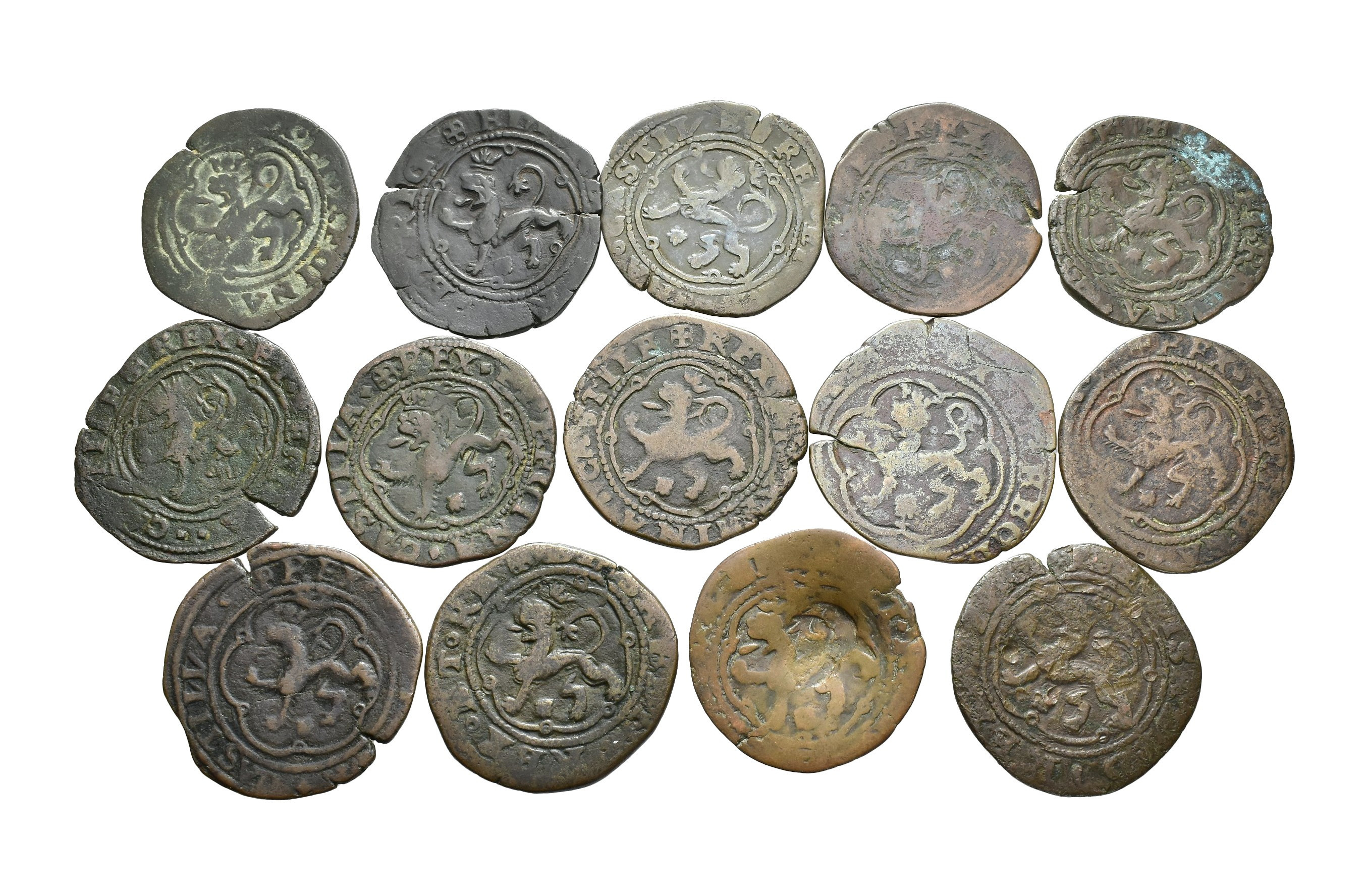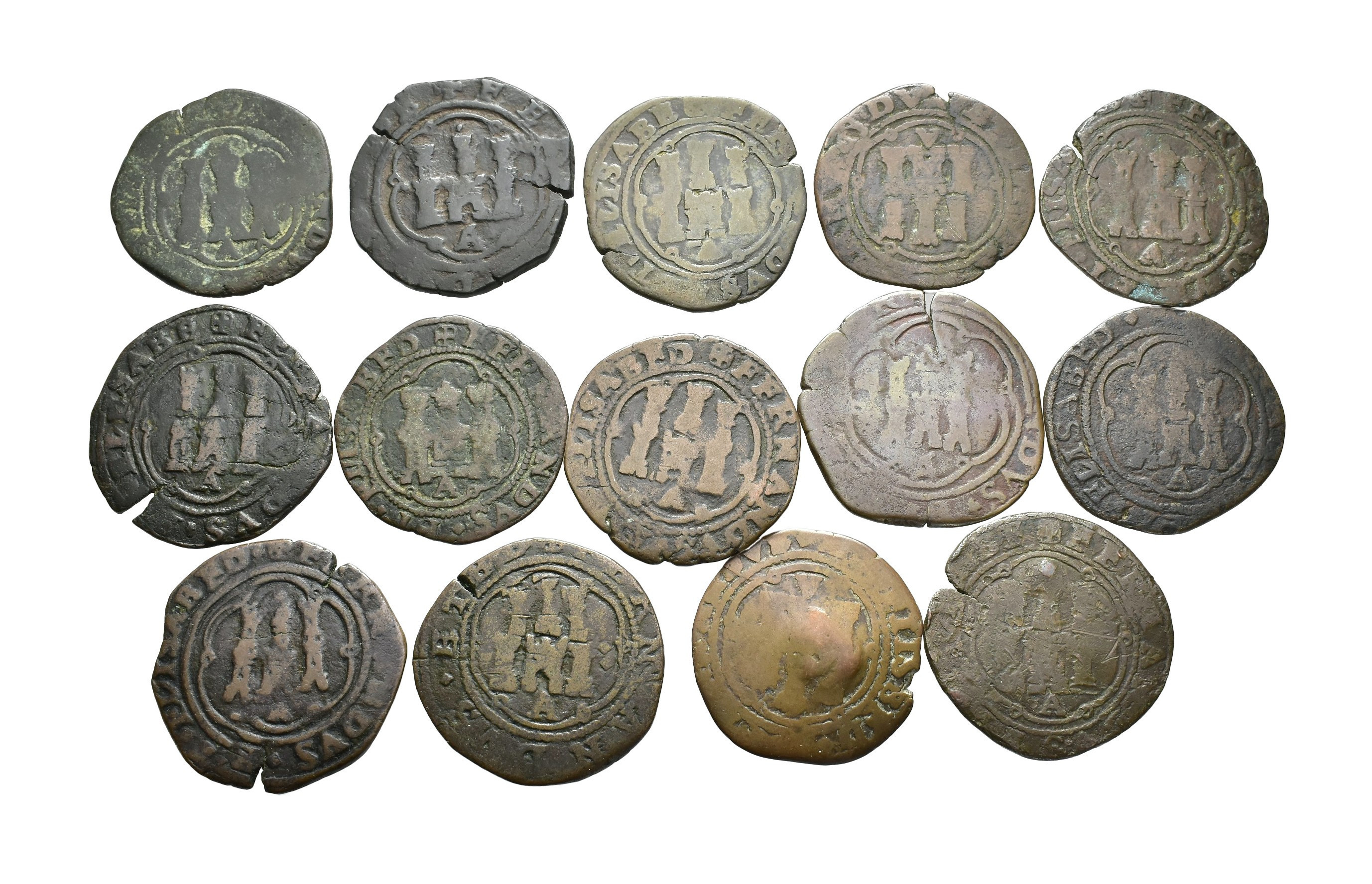 REYES CATÓLICOS. Lote de 14 piezas de 4 maravedís, Coruña, A bajo castillo. Orol-MO.60, 62, 64, 67, 69, 73, 76, 79, 82, 84, 86, 88, 90 y 93. BC-/MBC-.