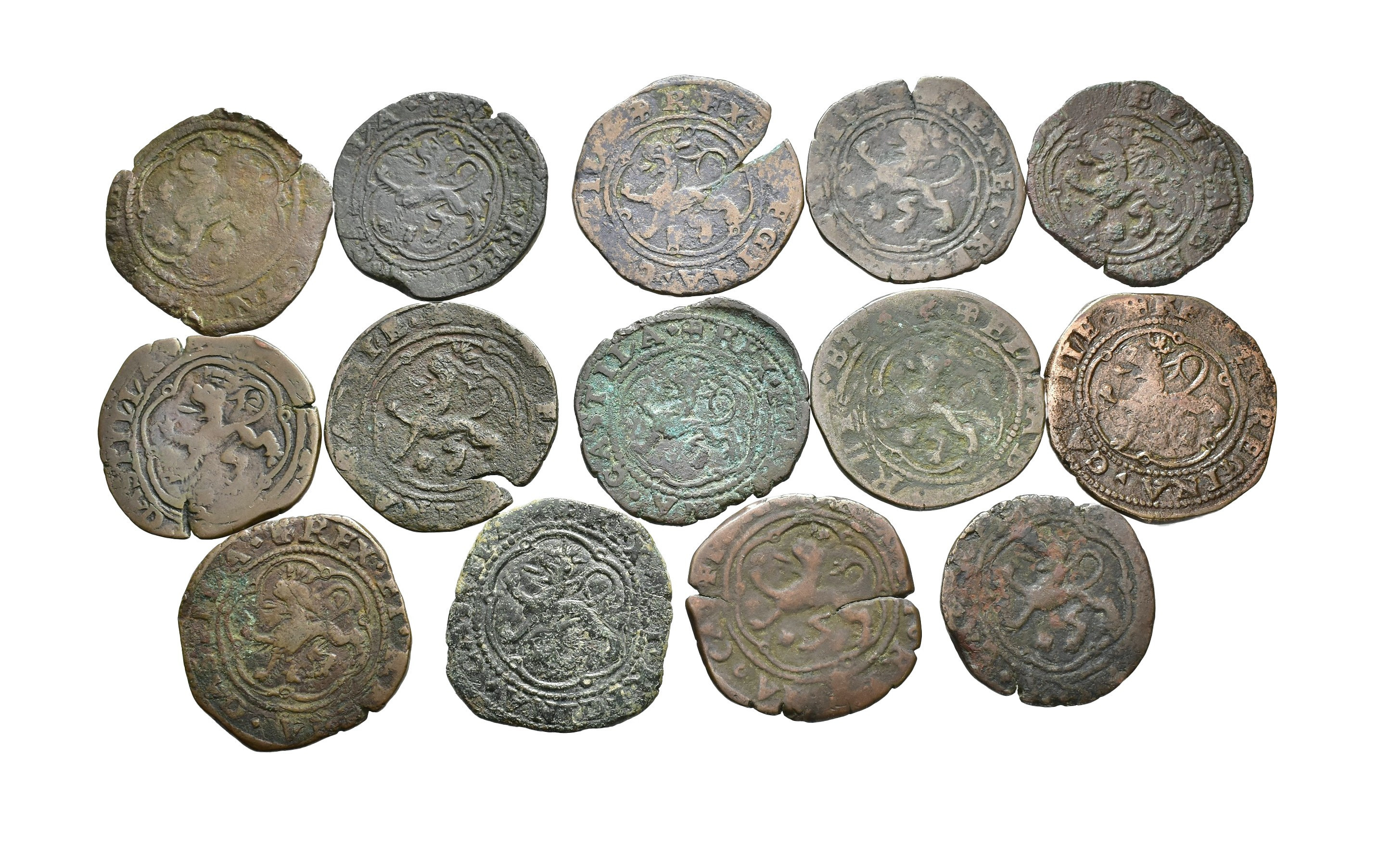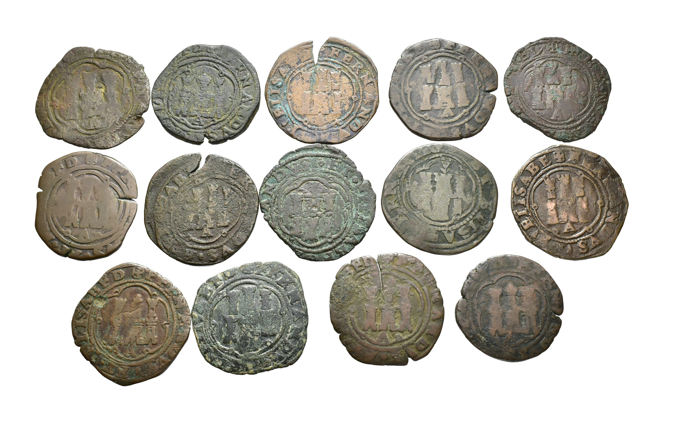 REYES CATÓLICOS. Lote de 14 piezas de 4 maravedís, Coruña, A bajo castillo. Orol-MO.61, 63, 66, 68, 71, 74, 77, 80, 83, 85, 87, 89, 91 y 94. BC-/MBC-.