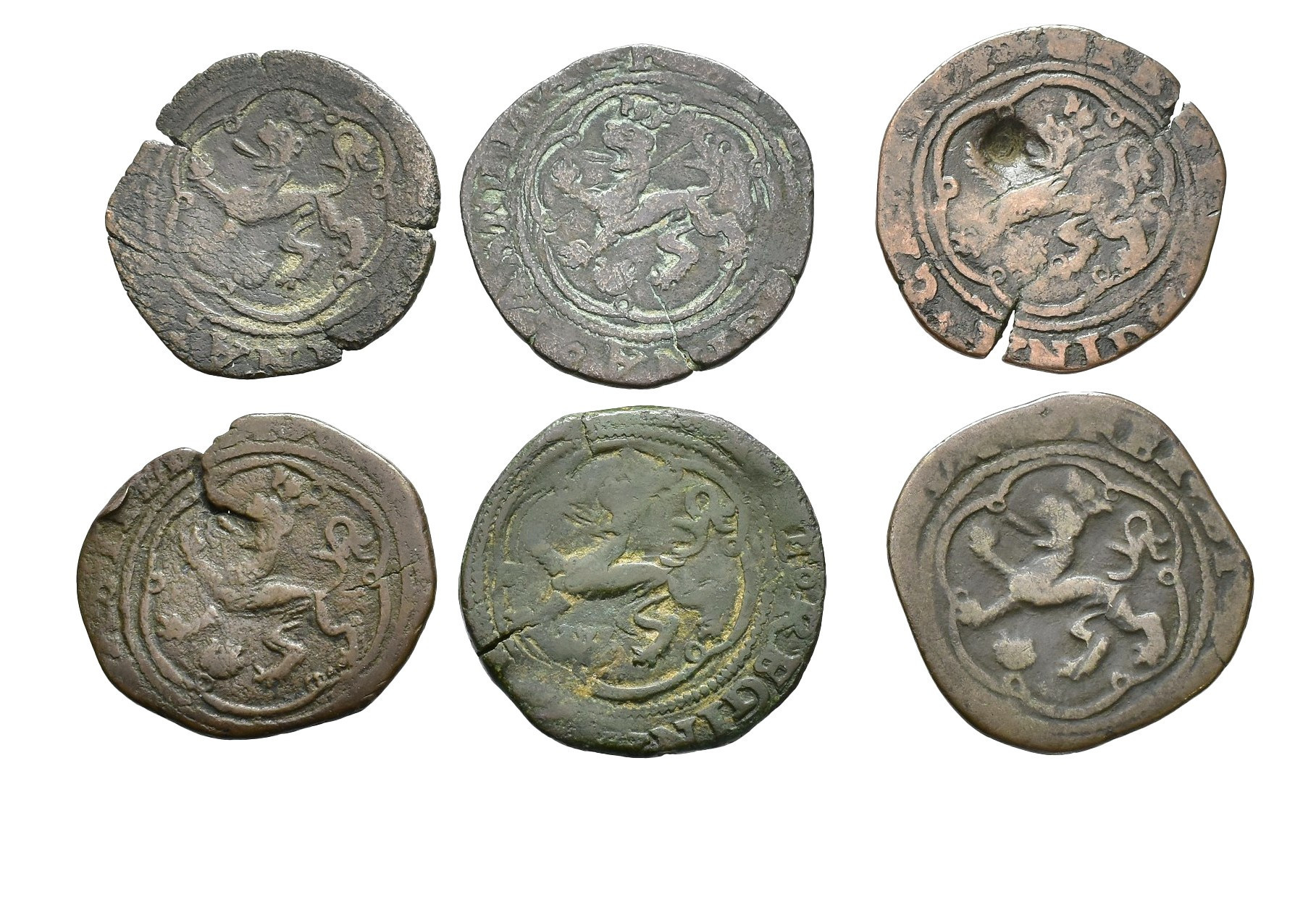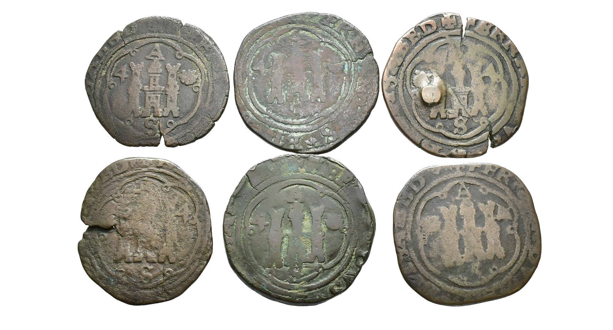REYES CATÓLICOS. Lote de 6 piezas de 4 maravedís, Coruña, A y S, venera y valor en diferentes posiciones. Orol-MO.109, 110, 111, 114, 115 y 116. BC/MBC-. Muy escasa.