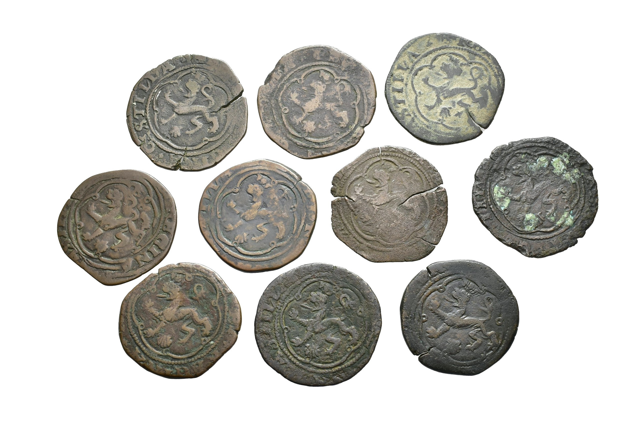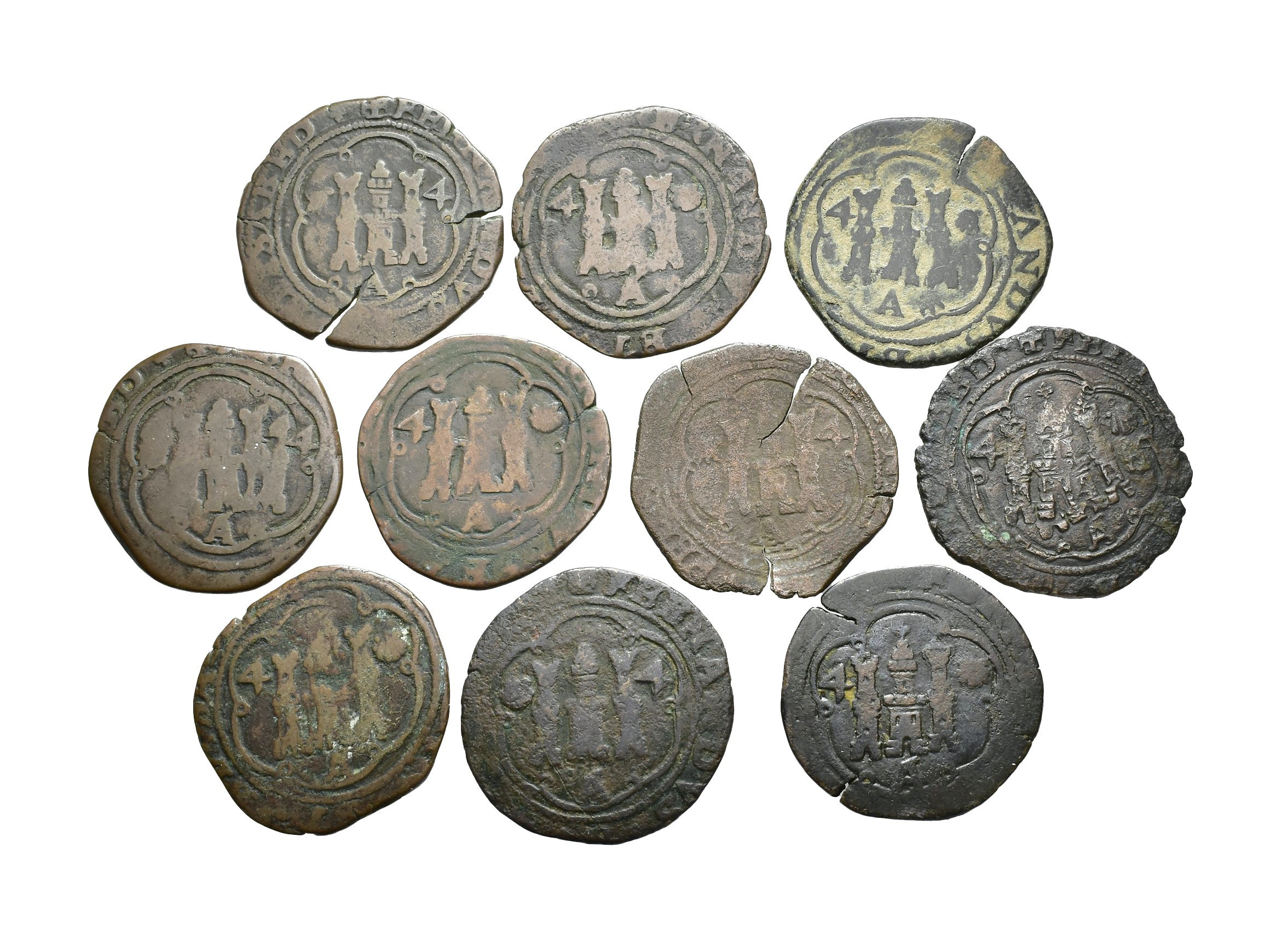 REYES CATÓLICOS. Lote de 10 piezas de 4 maravedís, Coruña, venera y valor en anv, venera en rev. en diferentes posiciones. Orol-MO.96, 97, 98, 99, 100, 102, 103, 104, 105 y 117. BC/MBC-.