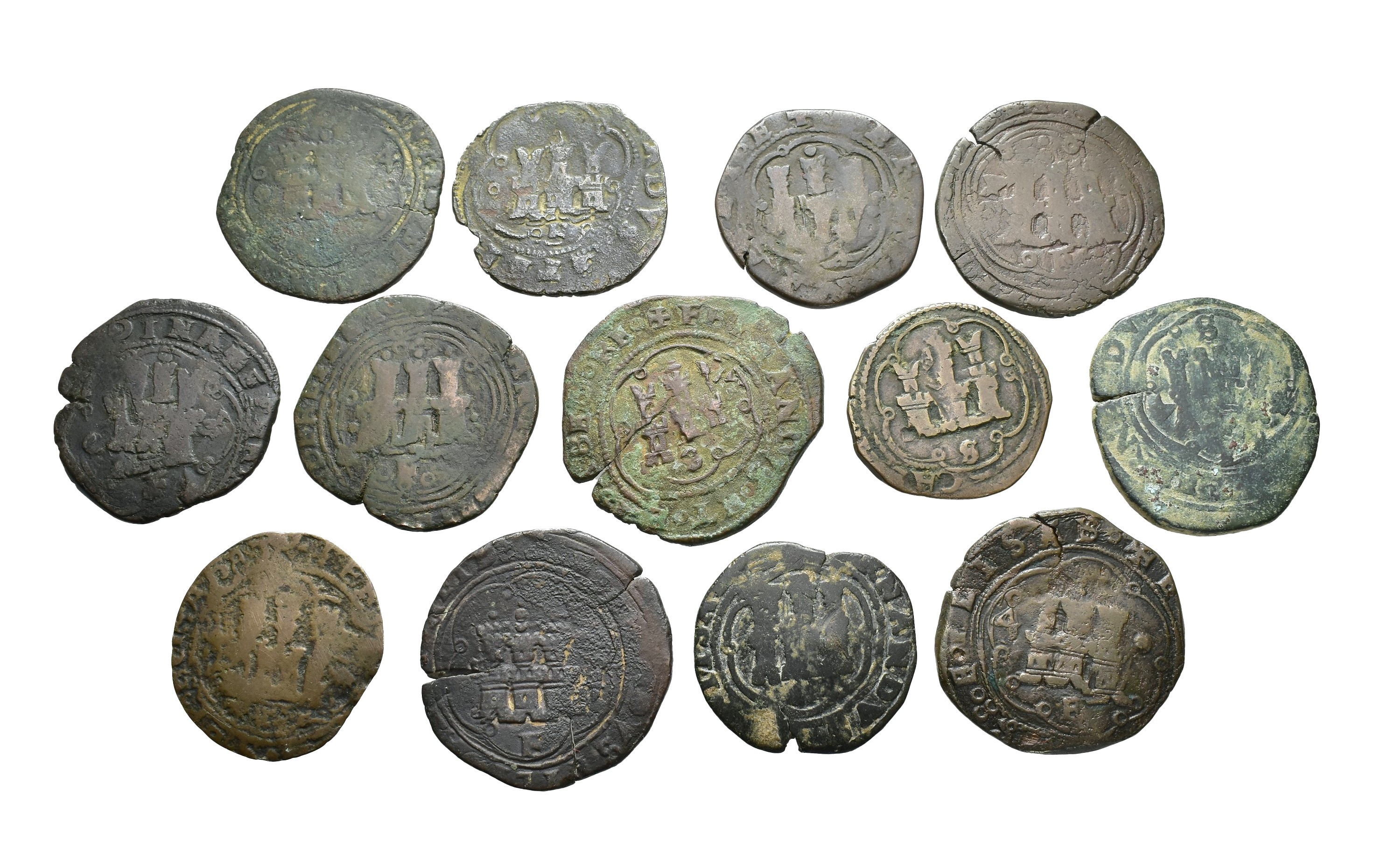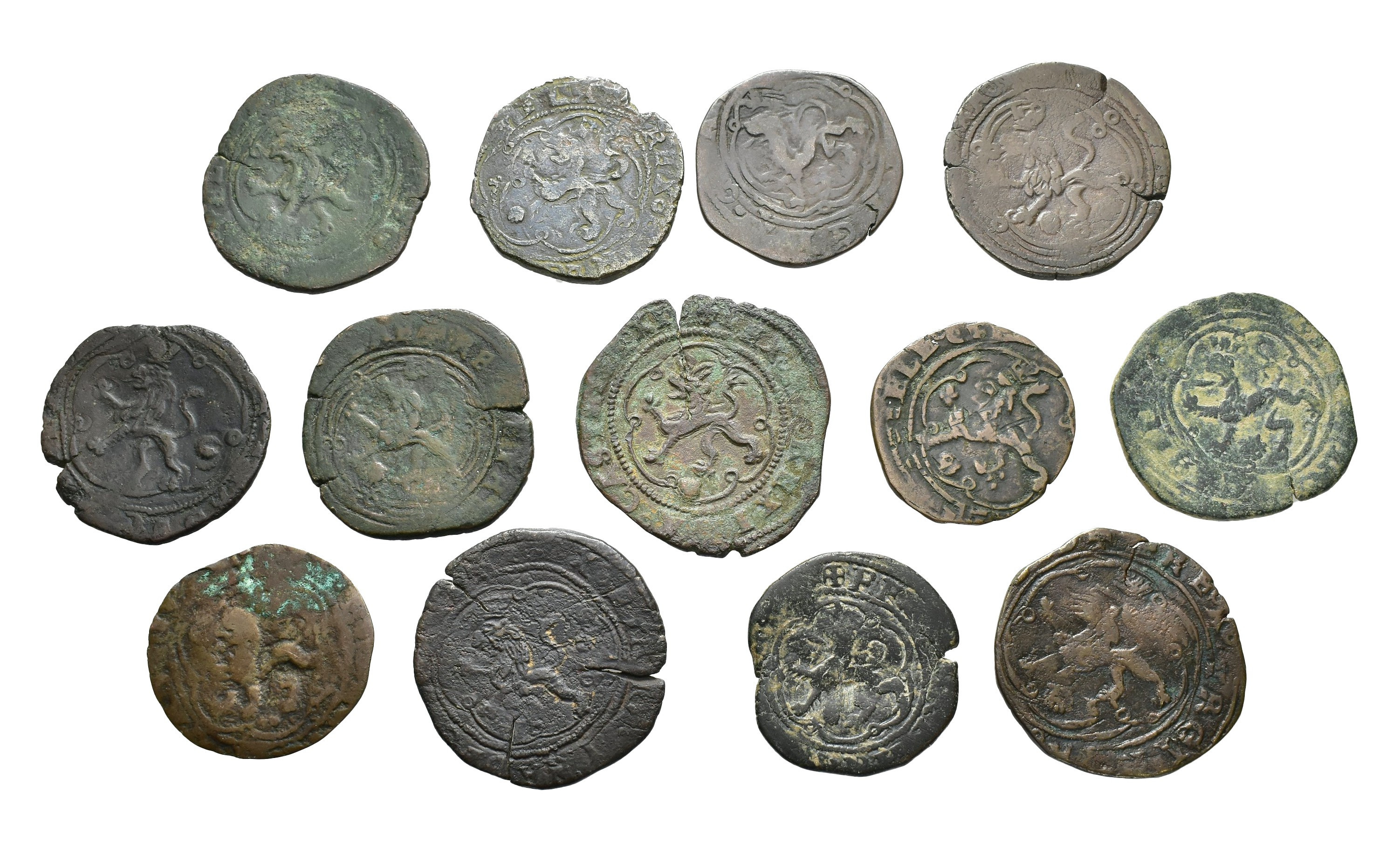 REYES CATÓLICOS. Lote de 13 piezas de 4 maravedís, Coruña, S con y sin valor (2), F con y sin valor (7) y 3 dudosas. Orol-MO.119, 120, 124, 125, 126, 127, 131, 135, 136, 137, 138 y 139. RC/MBC-.
