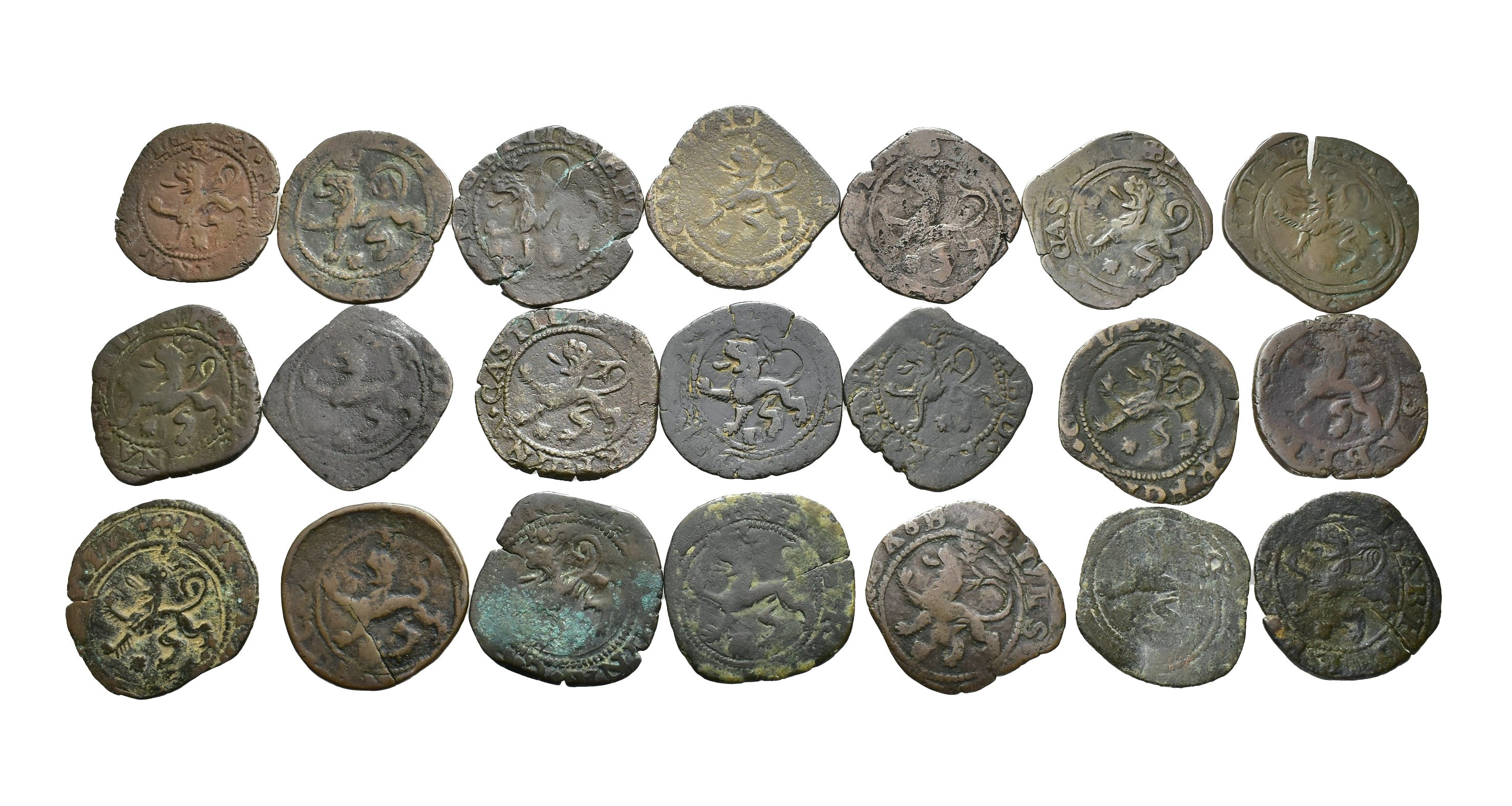 REYES CATÓLICOS. Lote de 21 piezas de 2 maravedís, Coruña, A con diferentes posiciones y adornos. Orol-MO.161, 163, 165, 166, 169, 172, 174, 177, 179, 181, 183, 185, 187, 190, 191, 193, 195, 197, 199, 201, 204. BC+/MBC.