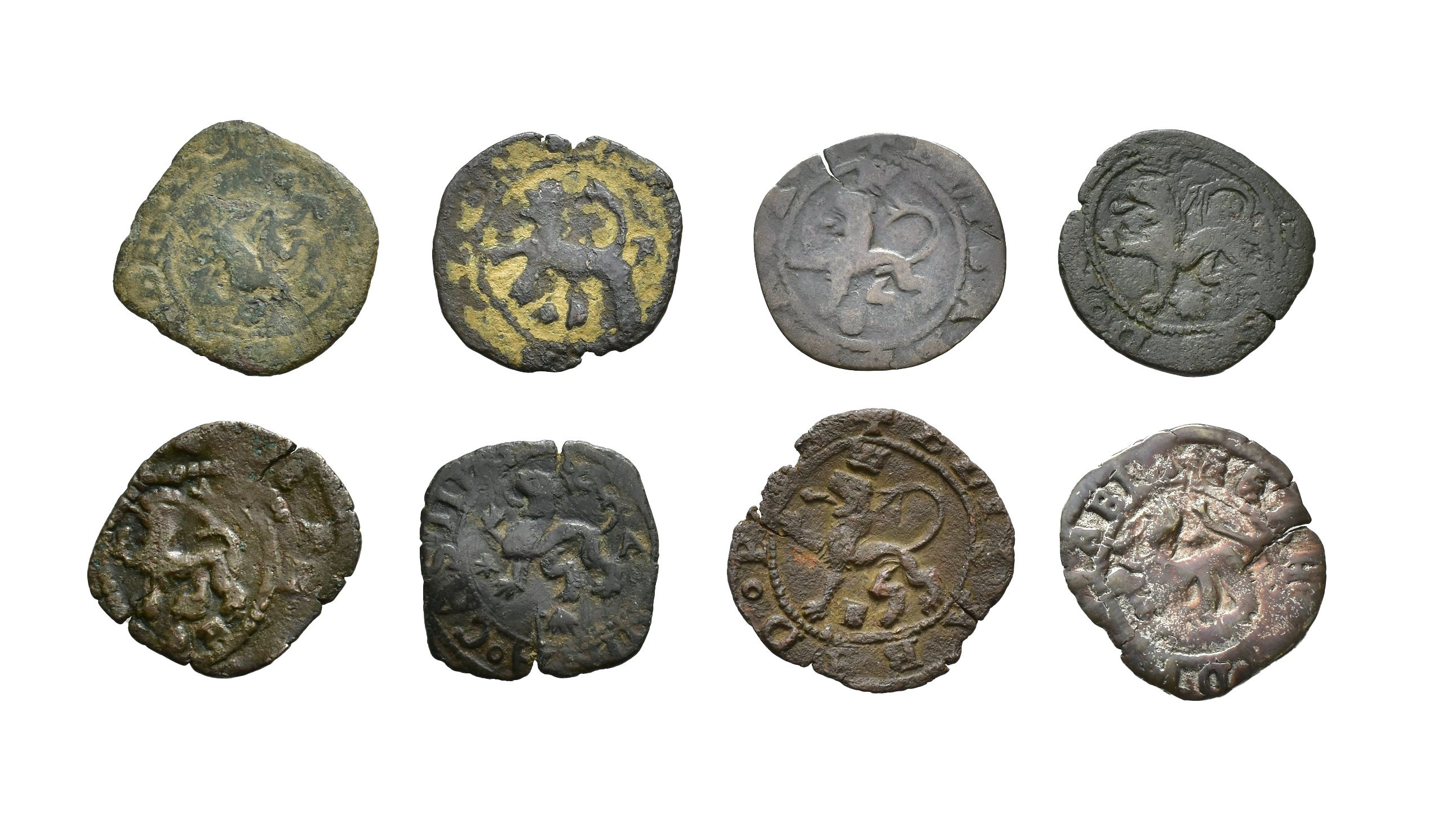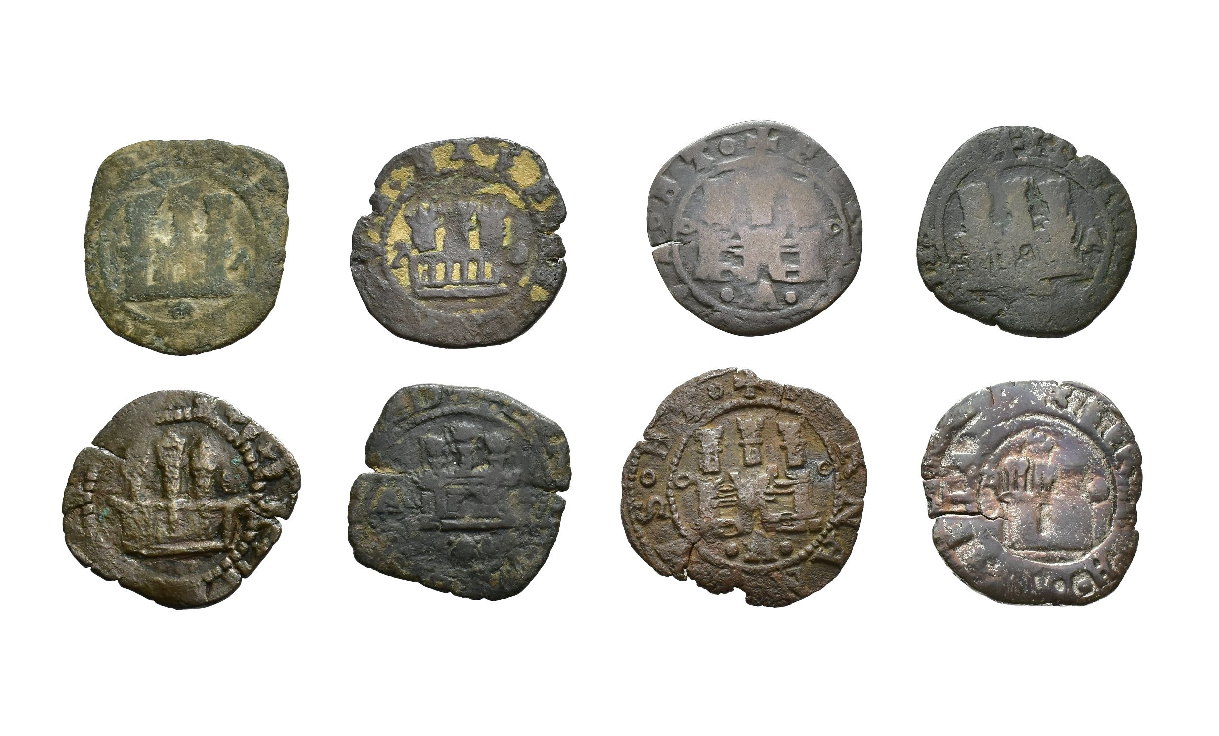 REYES CATÓLICOS. Lote de 8 piezas de 2 maravedís, Coruña, A con diferentes posiciones y adornos. Orol-MO.148, 149, 150, 206, 207, 208, 209 y 212. BC/BC+.