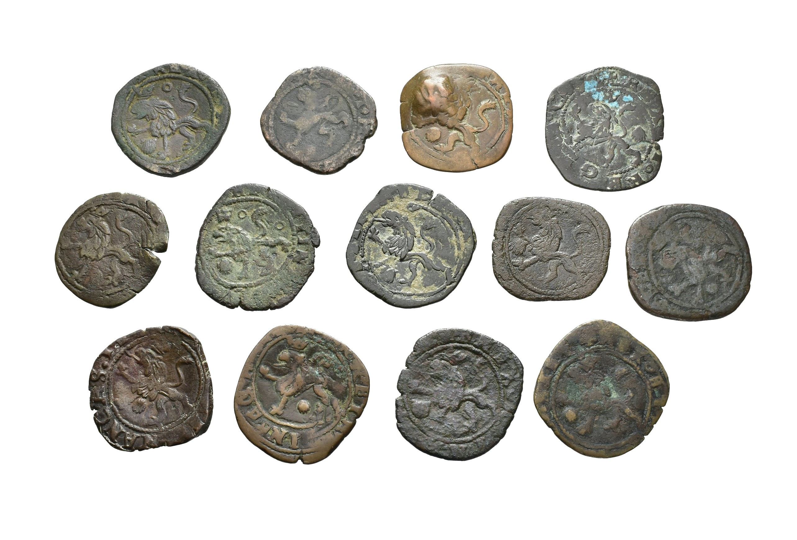 REYES CATÓLICOS. Lote de 23 piezas de 2 maravedís, Coruña, F y poco visibles. Orol-MO.273, 274, 275, 278, 279, 280, 282, 283, 284, 285, 286, 287 y una sin ilustrar. BC/MBC-.