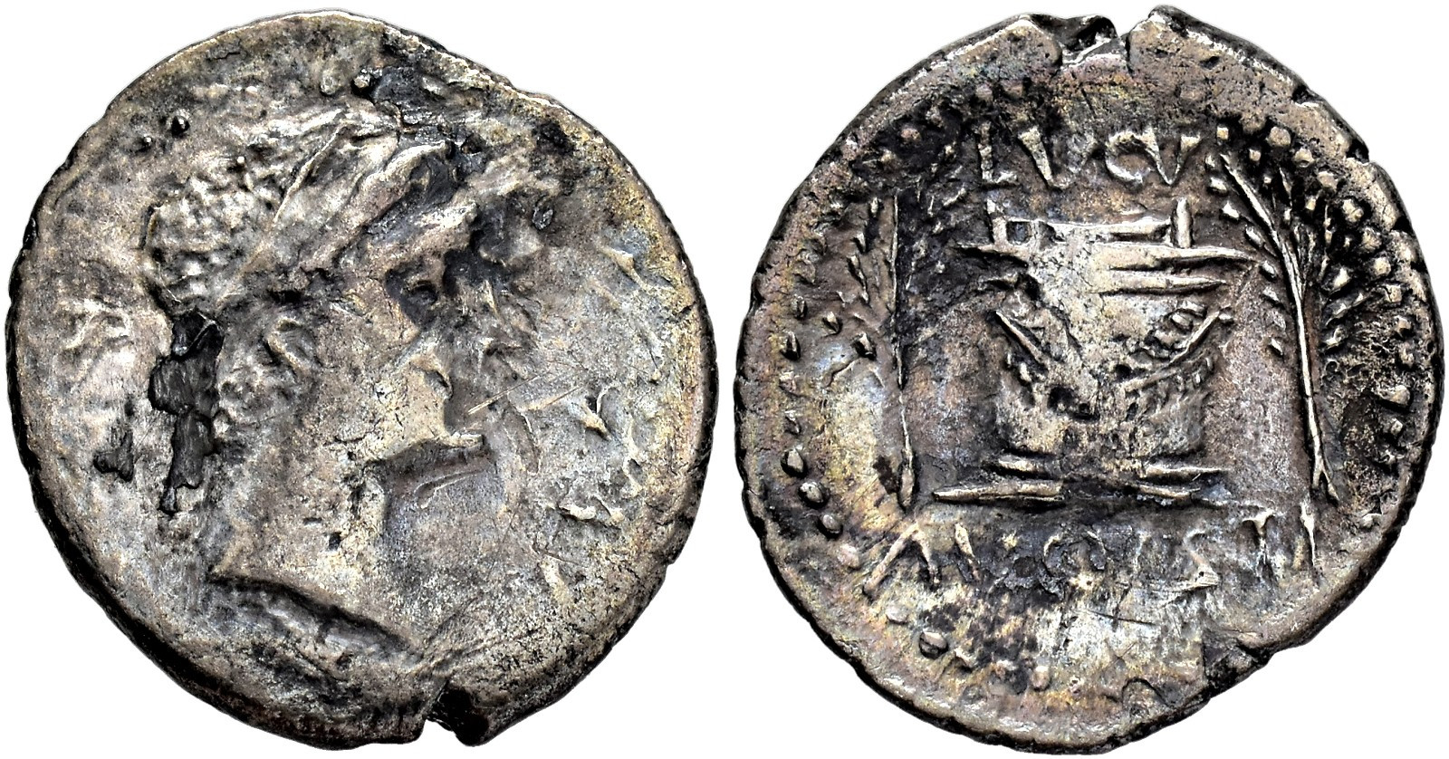 GRECIA ANTIGUA. MAURETANIA. JUBA II. Iol Caesarea. Denario. A/ Cabeza diademada a der. (REX IVBA). R/ Altar con guirnalda entre dos ramas de laurel; LVCV/AVGSTI. AR 2,79 g. 19,4 mm. COP-556; MAA-82. Acuñación defectuosa en anv. BC+.