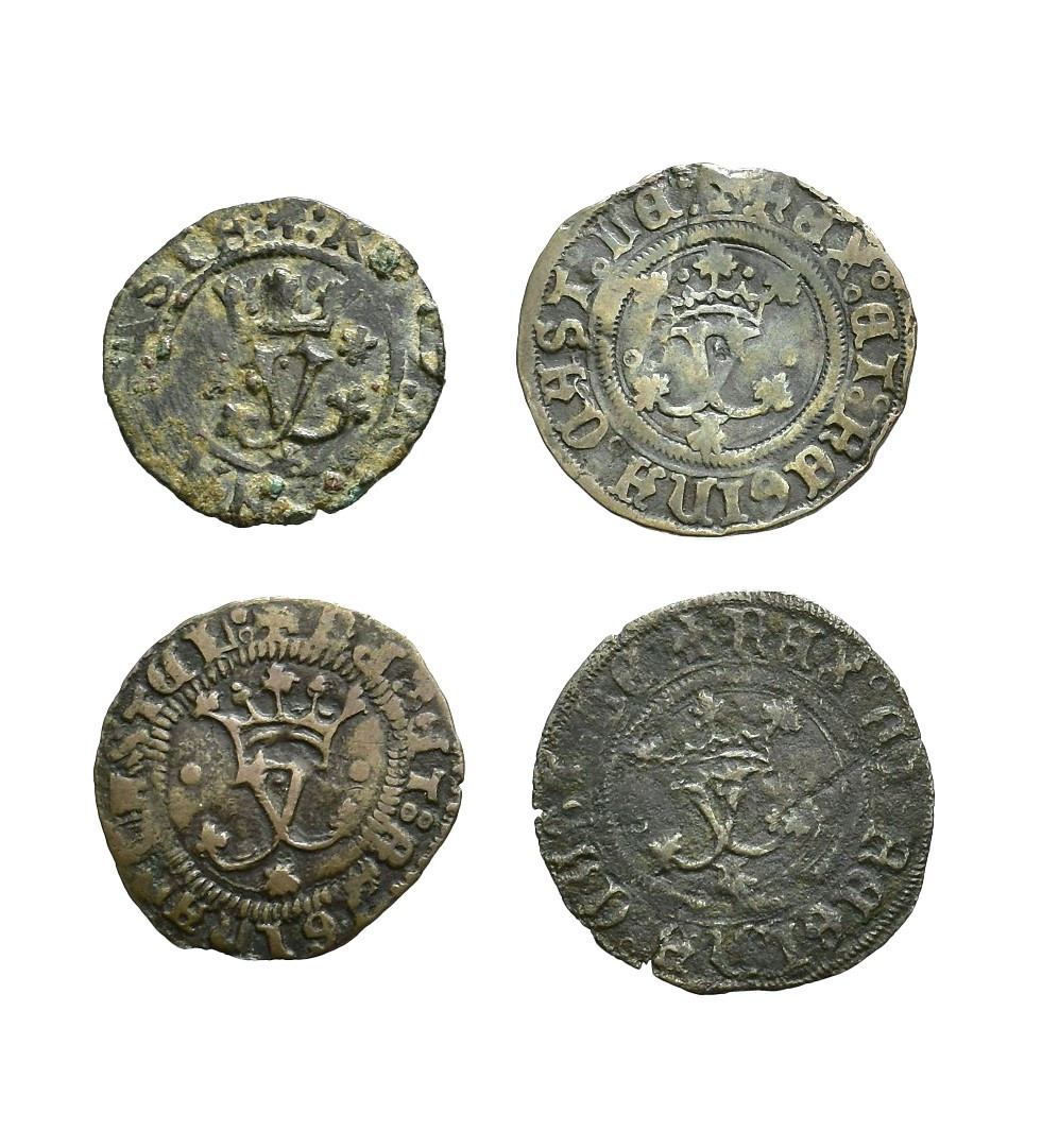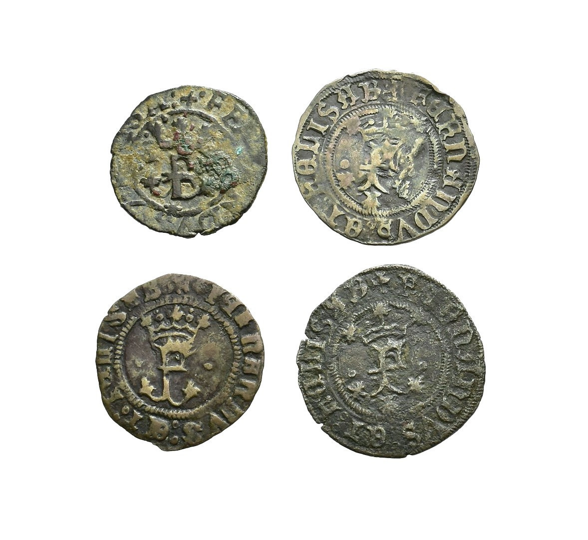 REYES CATÓLICOS. Lote de 4 blancas: 3 de Coruña y 1 posiblemente de Cuenca. Con venera en anv. y rev. y en rev. Orol-MO.39, 44, 45 y 49. BC+/MBC.