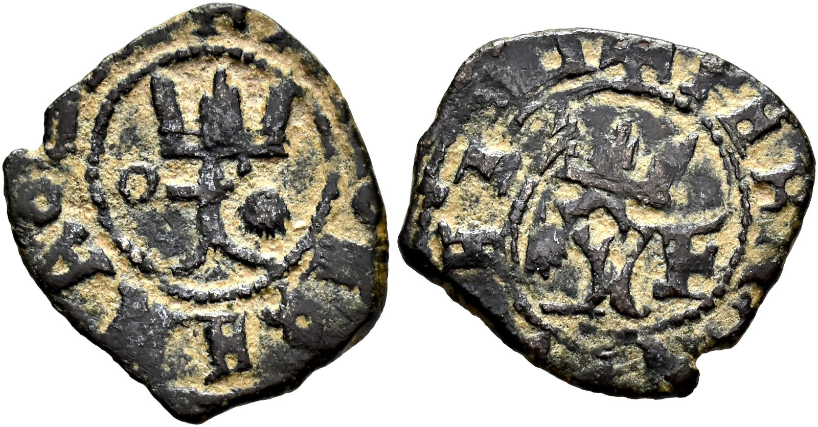 REYES CATÓLICOS. Blanca. Coruña. Roel-venera en anv. y venera-F en rev. CU 1,17 g. 15,2 mm. RS-269; Orol-MO.32. MBC-. Escasa.