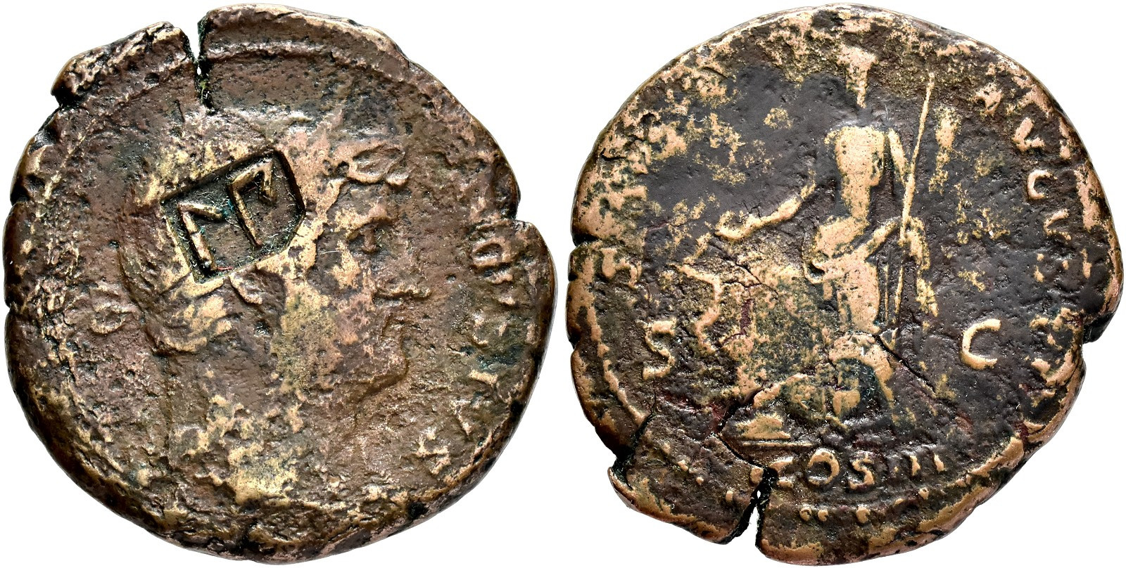 IMPERIO ROMANO. ADRIANO. Roma. As. A/ Cabeza laureada a der.; (HADRIANVS) AVGVSTVS. R/ Salus a izq. con pátera y cetro, delante serpiente enroscada en altar; S(ALVS) AVGVSTI, S-C, exergo COS III. AE 11,14 g. 28,4 mm. RIC-828. Resello con signos L y Bi ibéricos dentro de rectángulo. El resello MBC, la moneda BC-.