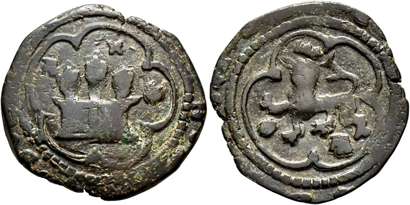 REYES CATÓLICOS. 4 maravedís. Coruña. A y venera en anv. y venera y A en rev. CU 6,31 g. 28,4 mm. RS-112 var. Orol-MO.56. MBC-. Escasa.