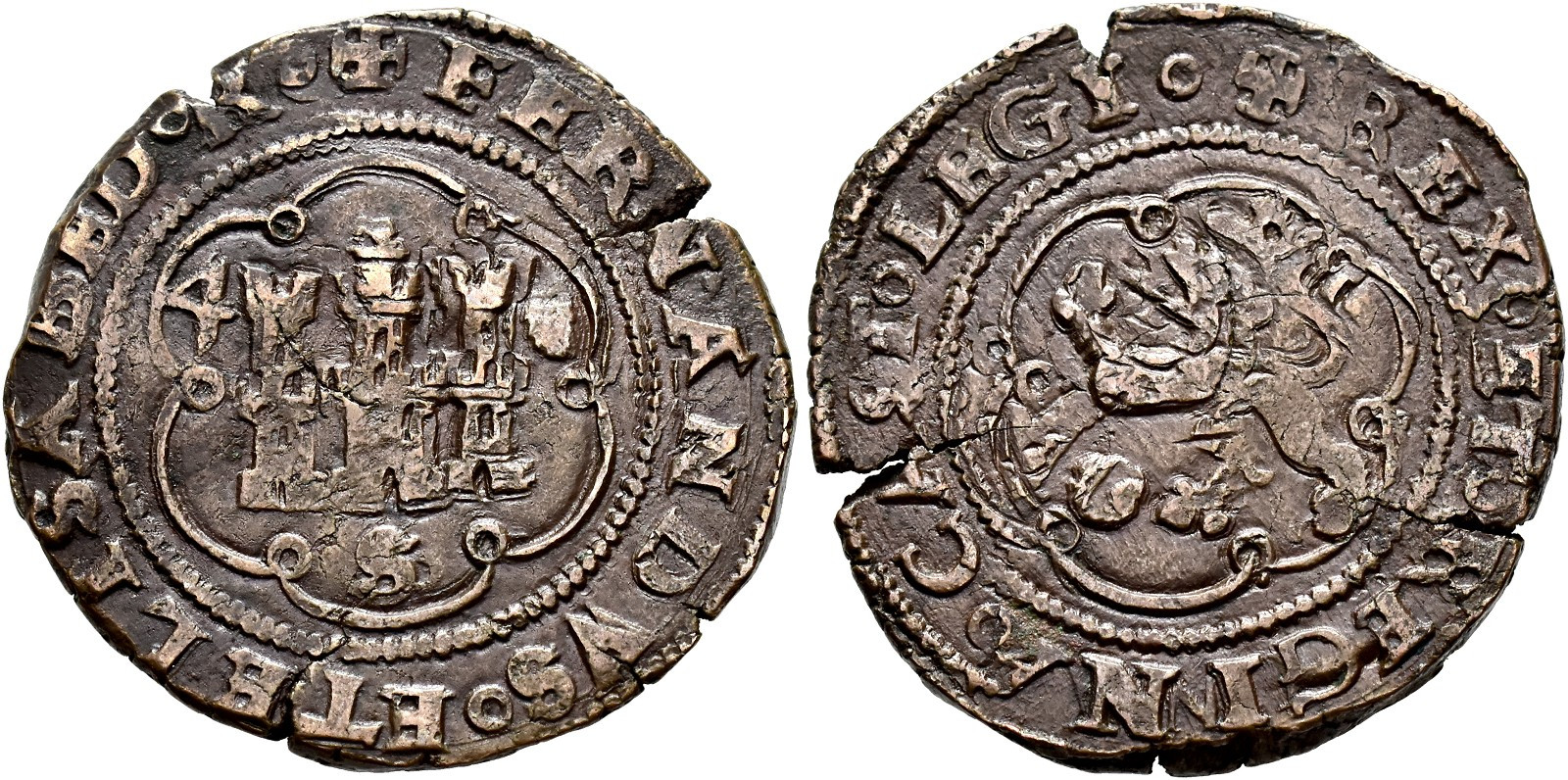 REYES CATÓLICOS. 4 maravedís. Coruña. Valor, venera y S en anv. Venera en rev. CU 10,17 g. 30,5 mm. RS-123; Orol-MO.121 Pequeñas grietas. MBC/MBC+. Escasa.