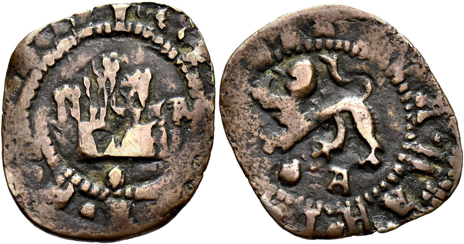 REYES CATÓLICOS. 2 maravedís. Coruña. A en rev. y venera en anv. y rev. CU 2,5 g. 23,9 mm. RS-no; Orol-MO.141 MBC-. Rara.