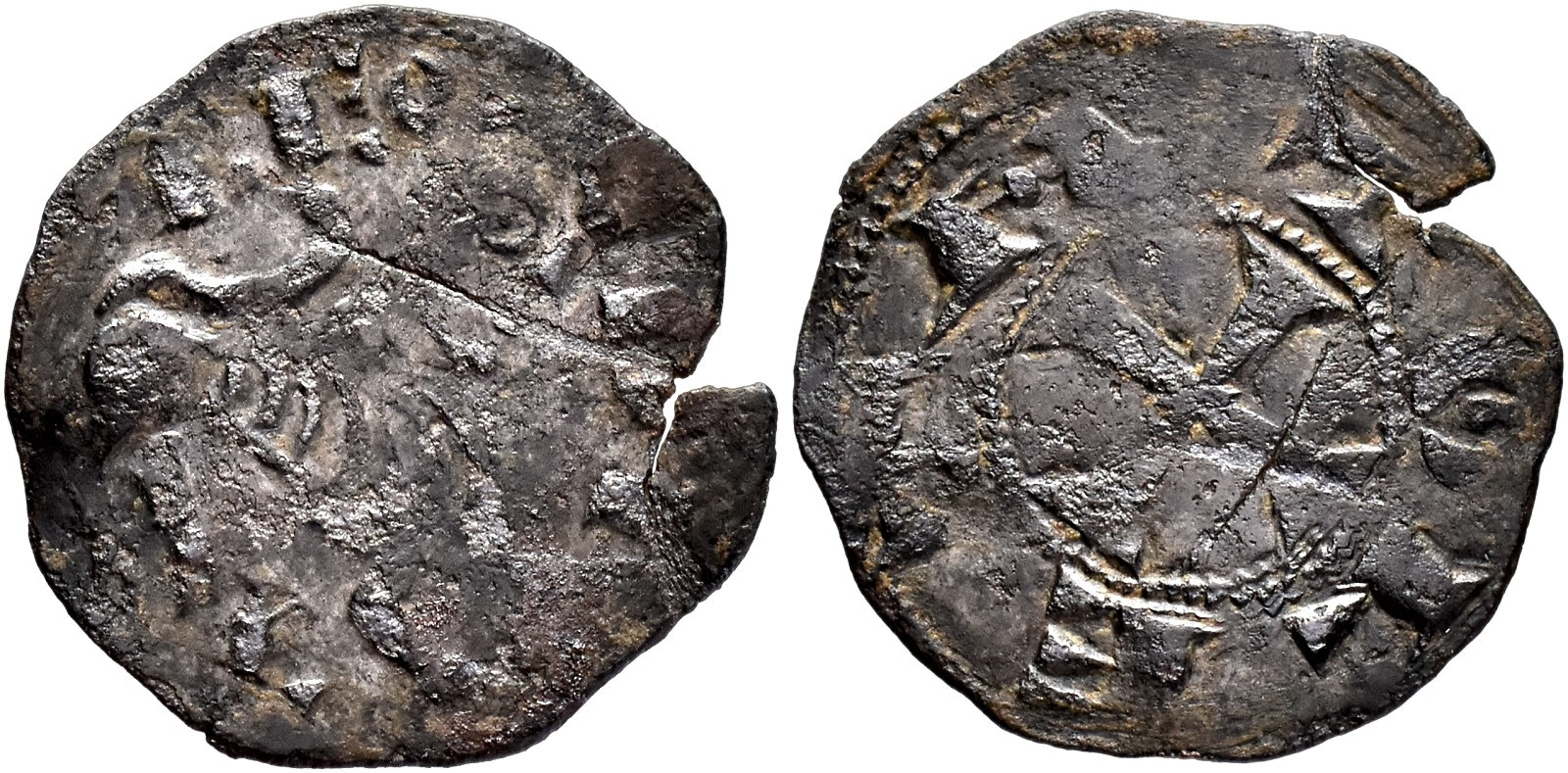 REINOS DE CASTILLA Y LEÓN. ALFONSO VII. Dinero. ¿Lugo? A/ LEO-NI. L entre las patas. R/ TOLETA. VE 0,75 g. 17,7 mm. III-no; BMM-101 var.; Orol-ME.7, mismo ejemplar. Cospel abierto. Leves erosiones. MBC-. Rarísima.