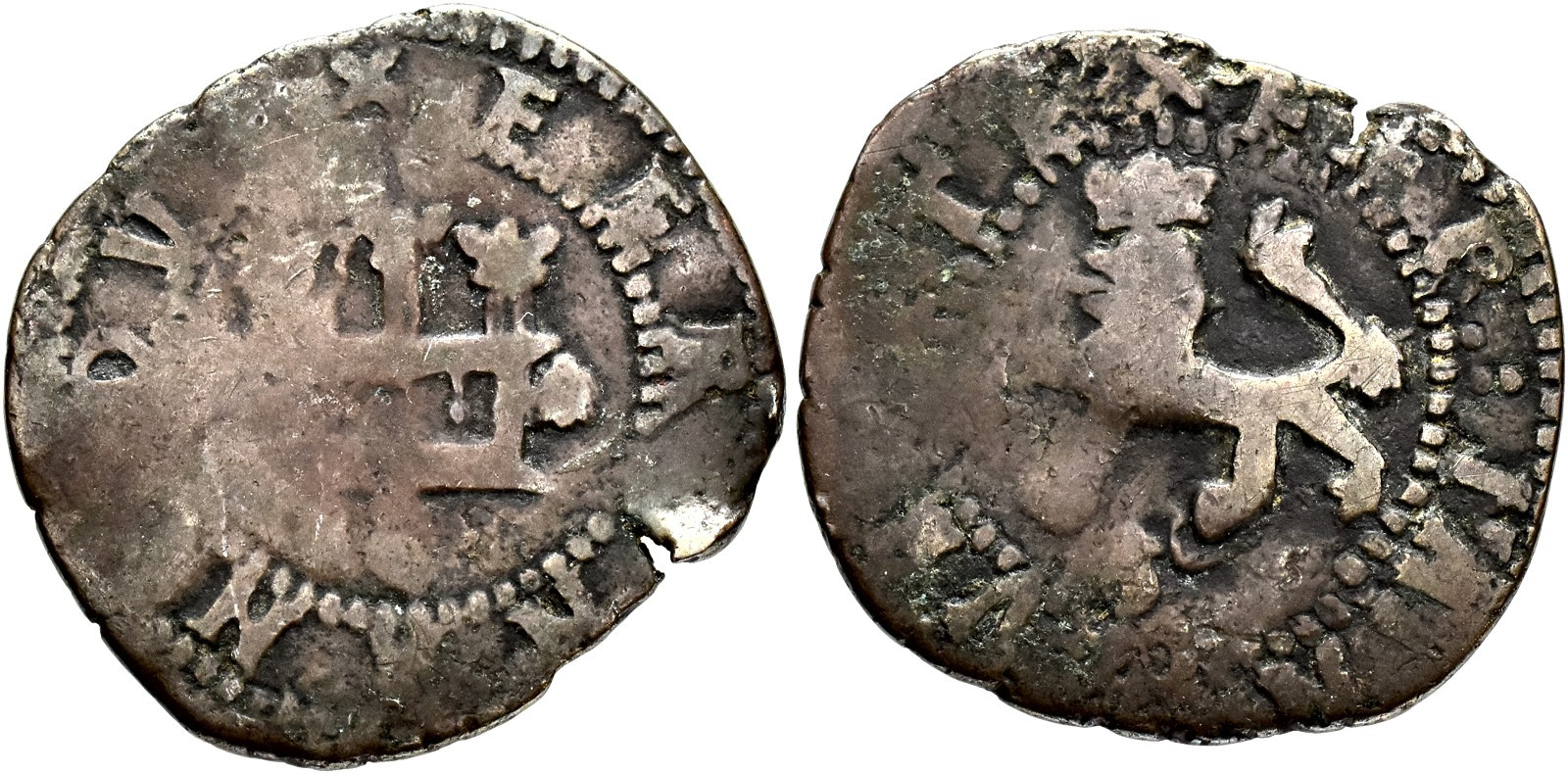 REYES CATÓLICOS. 2 maravedís. Coruña. Dos veneras en anv. y dos en rev. CU 4,05 g. 25,06 mm. RS-no. ¿Inédita? Orol-MO.155. Cospel abierto. BC/BC+.