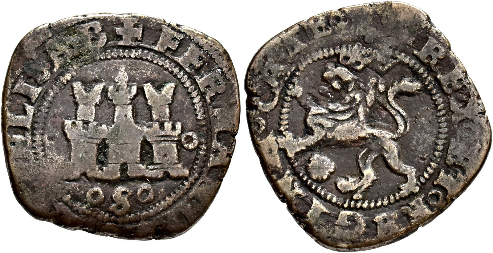 REYES CATÓLICOS. 2 maravedís. Coruña. S entre roeles. CU 4,52 g. 26,3 mm. RS-198; Orol-MO.231 BC+/MBC-.