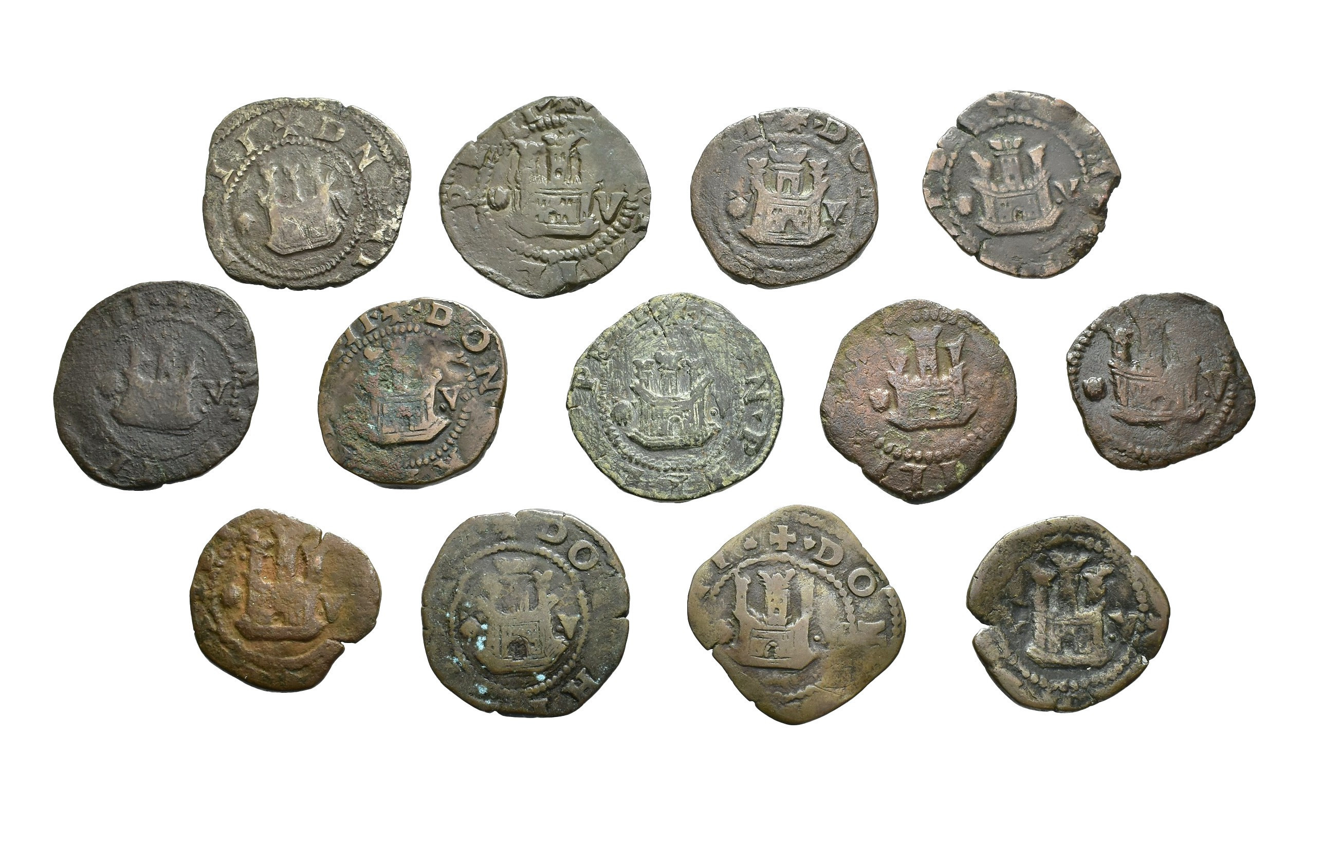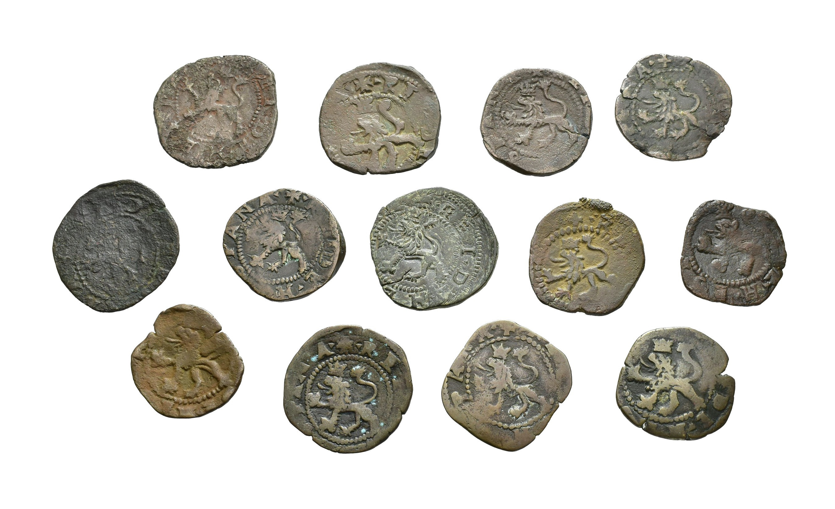 FELIPE II. Lote de 13 monedas de 2 maravedís, Coruña V. Orol-MO. 95, 98, 300, 302, 304, 306, 309, 311, 313, 315, 317, 320 y 322. BC+/MBC.